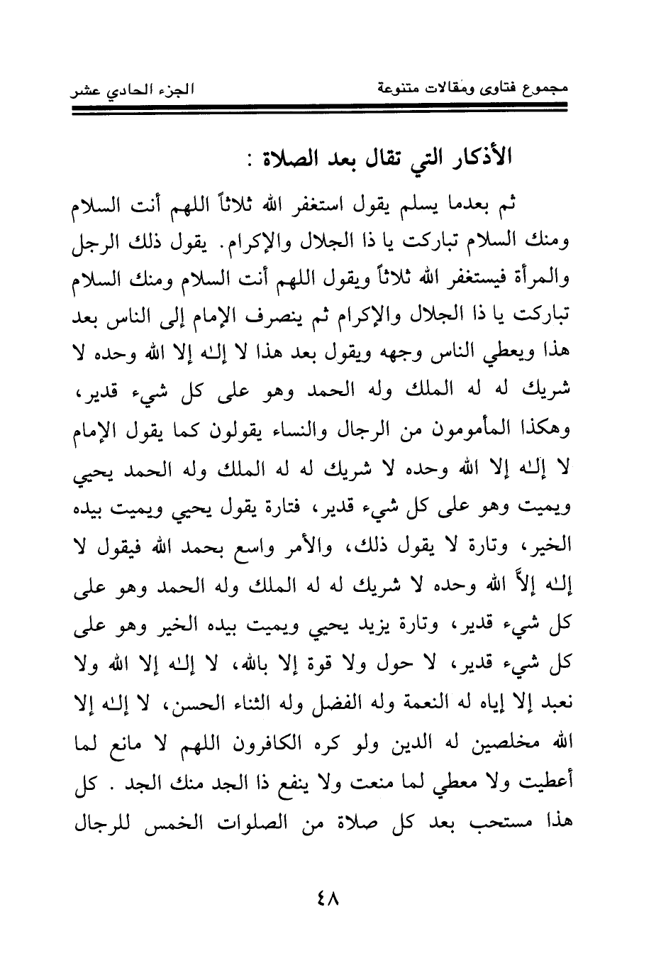ثم بعدما يسلم يقول: استغفر الله ثلاثا اللهم أنت السلام ومنك السلام تباركت يا ذا الجلال والإكرام. يقول ذلك الرجل والمرأة فيستغفر الله ثلاثا ويقول: اللهم أنت السلام ومنك السلام تباركت يا ذا الجلال والإكرام ثم ينصرف الإمام إلى الناس بعد هذا ويعطي الناس وجهه ويقول بعد هذا: لا إله إلا الله وحده لا شريك له له الملك وله الحمد وهو على كل شيء قدير، وهكذا المأمومون من الرجال والنساء يقولون كما يقول الإمام لا إله إلا الله وحده لا شريك له له الملك وله الحمد يحيي ويميت وهو على كل شيء قدير، فتارة يقول: يحيي ويميت بيده الخير، وتارة لا يقول ذلك، والأمر واسع بحمد الله فيقول: لا إله إلا الله وحده لا شريك له له الملك وله الحمد وهو على كل شيء قدير، وتارة يزيد: يحيي ويميت بيده الخير وهو على كل شيء قدير، لا حول ولا قوة إلا بالله، لا إله إلا الله ولا نعبد إلا إياه له النعمة وله الفضل وله الثناء الحسن، لا إله إلا الله مخلصين له الدين ولو كره الكافرون اللهم لا مانع لما أعطيت ولا معطي لما منعت ولا ينفع ذا الجد منك الجد. كل هذا مستحب بعد كل صلاة من الصلوات الخمس للرجال