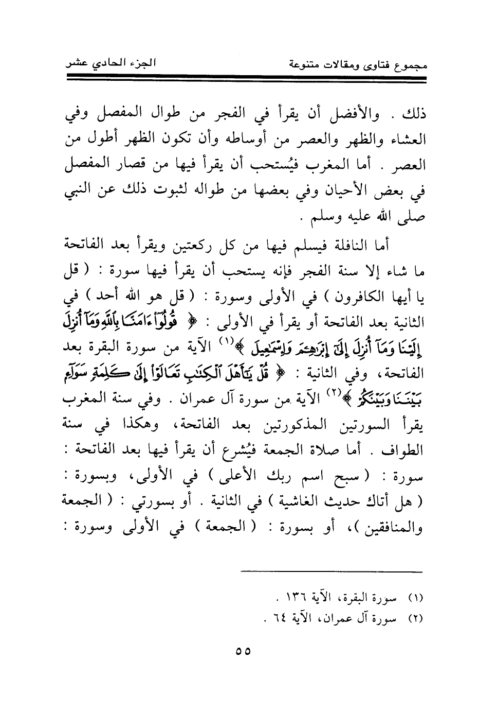 أما النافلة فيسلم فيها من كل ركعتين ويقرأ بعد الفاتحة ما شاء إلا سنة الفجر فإنه يستحب أن يقرأ فيها سورة: قل يا أيها الكافرون في الأولى وسورة: قل هو الله أحد في الثانية بعد الفاتحة أو يقرأ في الأولى: {قُولُوا آمَنَّا بِاللَّهِ وَمَا أُنْزِلَ إِلَيْنَا وَمَا أُنْزِلَ إِلَى إِبْرَاهِيمَ وَإِسْمَاعِيلَ} (¬1) الآية من سورة البقرة بعد الفاتحة، وفي الثانية: {قُلْ يَا أَهْلَ الْكِتَابِ تَعَالَوْا إِلَى كَلِمَةٍ سَوَاءٍ بَيْنَنَا وَبَيْنَكُمْ} (¬2) الآية من سورة آل عمران. وفي سنة المغرب يقرأ السورتين المذكورتين بعد الفاتحة، وهكذا في سنة الطواف. أما صلاة الجمعة فيشرع أن يقرأ فيها بعد الفاتحة: سورة: {سَبِّحِ اسْمَ رَبِّكَ الْأَعْلَى} (¬3) في الأولى، وبسورة: {هَلْ أَتَاكَ حَدِيثُ الْغَاشِيَةِ} (¬4) في الثانية. أو بسورتي: (الجمعة والمنافقين) ، أو بسورة: (الجمعة) في الأولى وسورة: