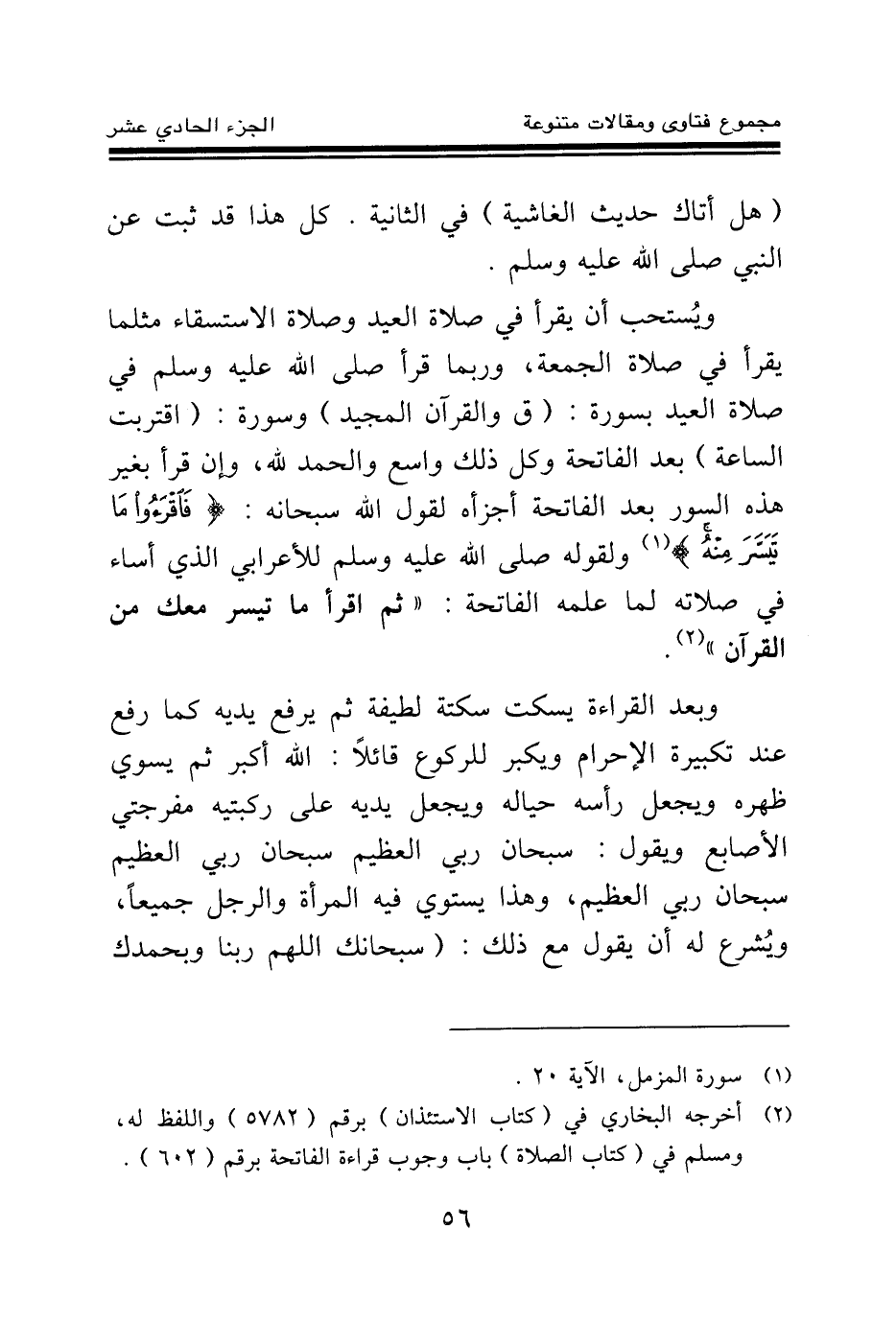 ويستحب أن يقرأ في صلاة العيد وصلاة الاستسقاء مثلما يقرأ في صلاة الجمعة، وربما قرأ صلى الله عليه وسلم في صلاة العيد بسورة: {ق وَالْقُرْآنِ الْمَجِيدِ} (¬2) وسورة: {اقْتَرَبَتِ السَّاعَةُ} (¬3) بعد الفاتحة وكل ذلك واسع والحمد لله، وإن قرأ بغير هذه السور بعد الفاتحة أجزأه لقول الله سبحانه: {فَاقْرَءُوا مَا تَيَسَّرَ مِنْهُ} (¬4) «ولقوله صلى الله عليه وسلم للأعرابي الذي أساء في صلاته لما علمه الفاتحة ثم اقرأ ما تيسر معك من القرآن (¬5) »