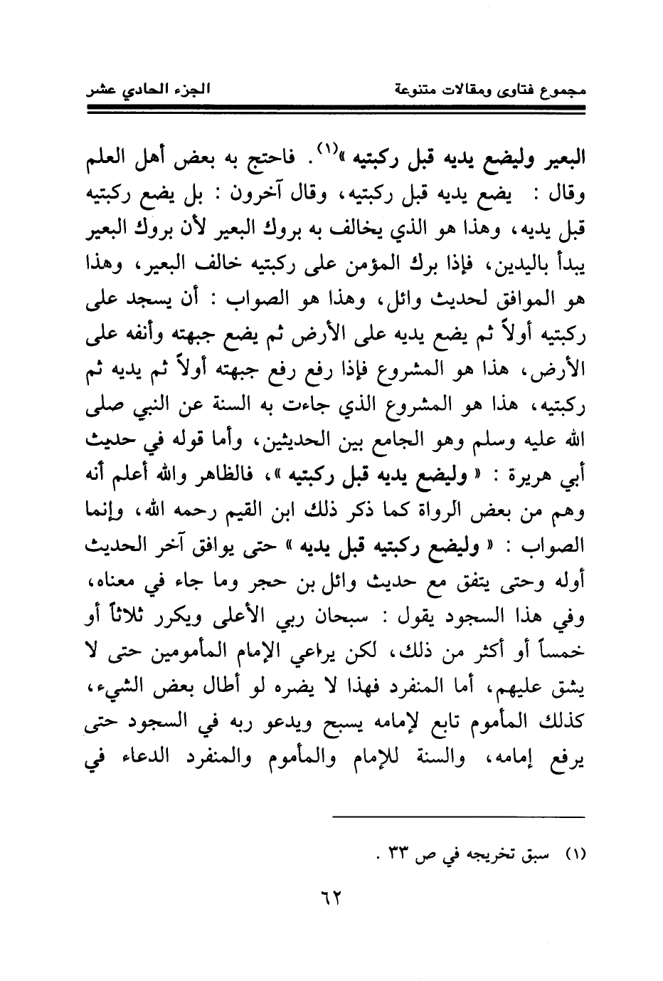 البعير وليضع يديه قبل ركبتيه (¬1) » . فاحتج به بعض أهل العلم وقال: يضع يديه قبل ركبتيه، وقال آخرون: بل يضع ركبتيه قبل يديه، وهذا هو الذي يخالف به بروك البعير لأن بروك البعير يبدأ باليدين، فإذا برك المؤمن على ركبتيه خالف البعير، وهذا هو الموافق لحديث وائل، وهذا هو الصواب: أن يسجد على ركبتيه أولا ثم يضع يديه على الأرض ثم يضع جبهته وأنفه على الأرض، هذا هو المشروع فإذا رفع رفع جبهته أولا ثم يديه ثم ركبتيه، هذا هو المشروع الذي جاءت به السنة عن النبي صلى الله عليه وسلم وهو الجامع بين الحديثين، وأما قوله في حديث أبي هريرة: «وليضع يديه قبل ركبتيه (¬2) » فالظاهر والله أعلم أنه وهم من بعض الرواة كما ذكر ذلك ابن القيم رحمه الله، وإنما الصواب: وليضع ركبتيه قبل يديه حتى يوافق آخر الحديث أوله وحتى يتفق مع حديث وائل بن حجر وما جاء في معناه، وفي هذا السجود يقول: سبحان ربي الأعلى ويكرر ثلاثا أو خمسا أو أكثر من ذلك، لكن يراعي الإمام المأمومين حتى لا يشق عليهم، أما المنفرد فهذا لا يضره لو أطال بعض الشيء، كذلك المأموم تابع لإمامه يسبح ويدعو ربه في السجود حتى يرفع إمامه، والسنة للإمام والمأموم والمنفرد الدعاء في