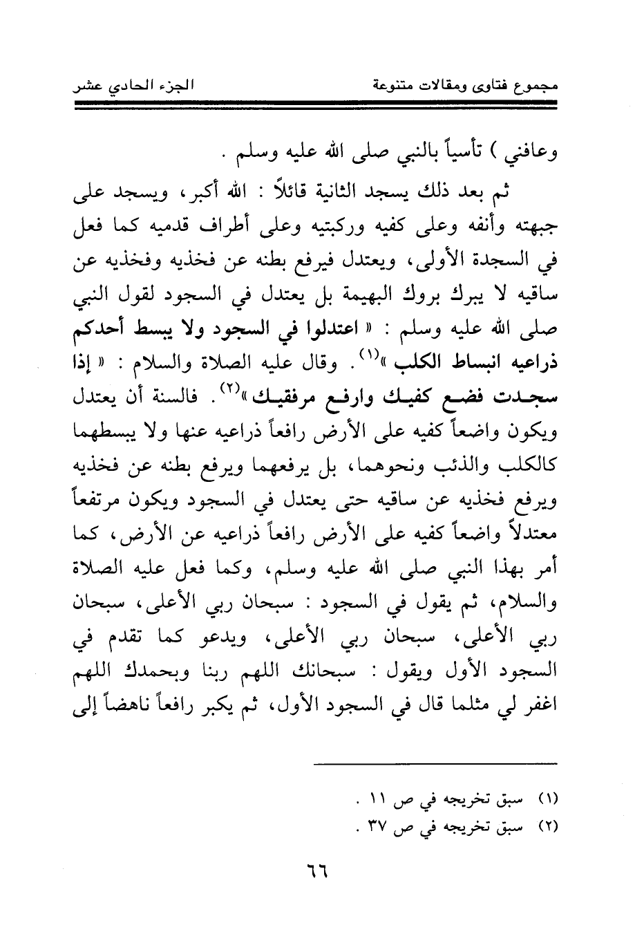 ثم بعد ذلك يسجد الثانية قائلا: الله أكبر، ويسجد على جبهته وأنفه وعلى كفيه وركبتيه وعلى أطراف قدميه كما فعل في السجدة الأولى، ويعتدل فيرفع بطنه عن فخذيه وفخذيه عن ساقيه لا يبرك بروك البهيمة بل يعتدل في السجود لقول النبي صلى الله عليه وسلم: «اعتدلوا في السجود ولا يبسط أحدكم ذراعيه انبساط الكلب (¬1) » . وقال عليه الصلاة والسلام: «إذا سجدت فضع كفيك وارفع مرفقيك (¬2) » . فالسنة أن يعتدل ويكون واضعا كفيه على الأرض رافعا ذراعيه عنها ولا يبسطهما كالكلب والذئب ونحوهما، بل يرفعهما ويرفع بطنه عن فخذيه ويرفع فخذيه عن ساقيه حتى يعتدل في السجود ويكون مرتفعا معتدلا واضعا كفيه على الأرض رافعا ذراعيه عن الأرض، كما أمر بهذا النبي صلى الله عليه وسلم، وكما فعل عليه الصلاة والسلام، ثم يقول في السجود: سبحان ربي الأعلى، سبحان ربي الأعلى، سبحان ربي الأعلى، ويدعو كما تقدم في السجود الأول ويقول: سبحانك اللهم ربنا وبحمدك اللهم اغفر لي مثلما قال في السجود الأول، ثم يكبر رافعا ناهضا إلى