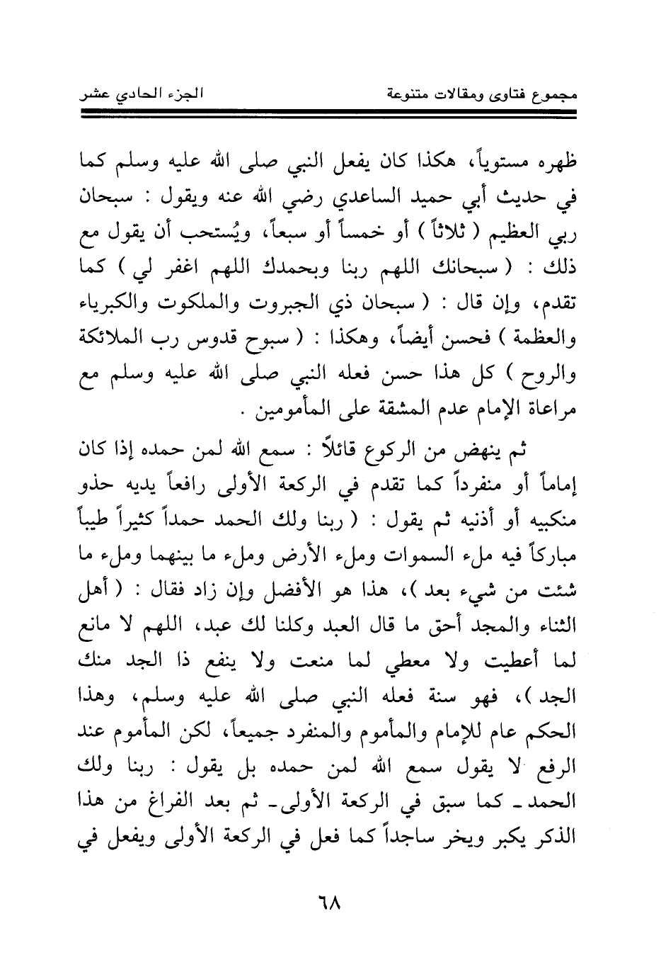 ثم ينهض من الركوع قائلا: سمع الله لمن حمده إذا كان إماما أو منفردا كما تقدم في الركعة الأولى رافعا يديه حذو منكبيه أو أذنيه ثم يقول: ربنا ولك الحمد حمدا كثيرا طيبا مباركا فيه ملء السماوات وملء الأرض وملء ما بينهما وملء ما شئت من شيء بعد، هذا هو الأفضل إن زاد فقال: أهل الثناء والمجد أحق ما قال العبد وكلنا لك عبد، اللهم لا مانع لما أعطيت ولا معطي لما منعت ولا ينفع ذا الجد منك الجد، فهو سنة فعله النبي صلى الله عليه وسلم، وهذا الحكم عام للإمام والمأموم والمنفرد جميعا، لكن المأموم عند الرفع لا يقول سمع الله لمن حمده بل يقول: ربنا ولك الحمد- كما سبق في الركعة الأولى- ثم بعد الفراغ من هذا الذكر يكبر ويخر ساجدا كما فعل في الركعة الأولى ويفعل في