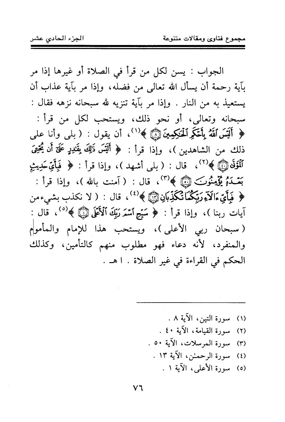 الجواب: يسن لكل من قرأ في الصلاة أو غيرها إذا مر بآية رحمة أن يسأل الله تعالى من فضله، وإذا مر بآية عذاب أن يستعيذ به من النار. وإذا مر بآية تنزيه لله سبحانه نزهه فقال: سبحانه وتعالى، أو نحو ذلك، ويستحب لكل من قرأ. {أَلَيْسَ اللَّهُ بِأَحْكَمِ الْحَاكِمِينَ} (¬1) أن يقول: (بلى وأنا على ذلك من الشاهدين) ، إذا قرأ: {أَلَيْسَ ذَلِكَ بِقَادِرٍ عَلَى أَنْ يُحْيِيَ الْمَوْتَى} (¬2) قال: (بلى أشهد) ، وإذا قرأ: {فَبِأَيِّ حَدِيثٍ بَعْدَهُ يُؤْمِنُونَ} (¬3) قال: (آمنت بالله) ، إذا قرأ: {فَبِأَيِّ آلَاءِ رَبِّكُمَا تُكَذِّبَانِ} (¬4) قال: (لا نكذب بشيء من آيات ربنا) ، إذا قرأ: {سَبِّحِ اسْمَ رَبِّكَ الْأَعْلَى} (¬5) قال: (سبحان ربي الأعلى) ، ويستحب هذا للإمام والمأموم والمنفرد؛ لأنه دعاء فهو مطلوب منهم كالتأمين، وكذلك الحكم في القراءة في غير الصلاة. اهـ.
