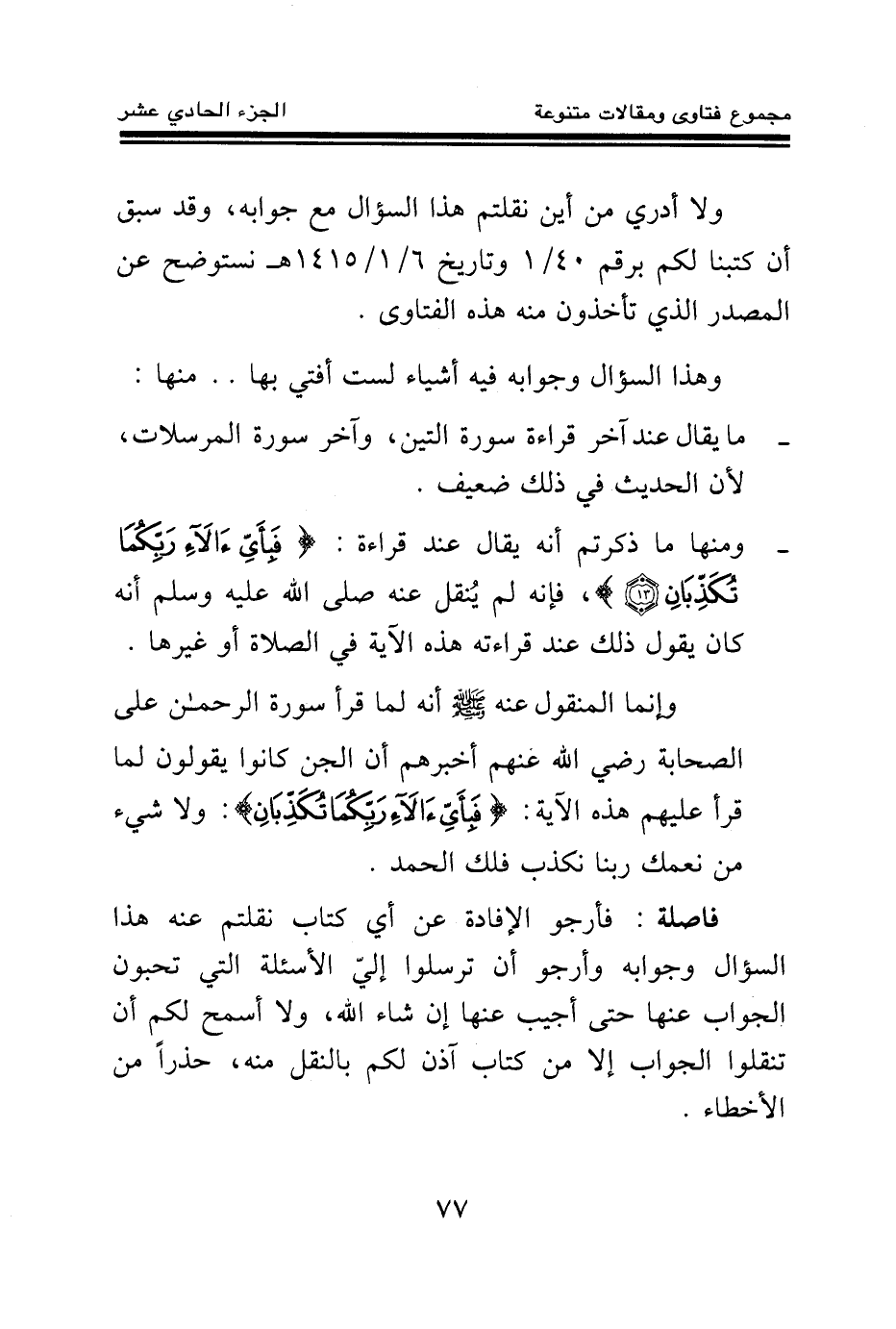 - ومنها ما ذكرتم أنه يقال عند قراءة: {فَبِأَيِّ آلَاءِ رَبِّكُمَا تُكَذِّبَانِ} (¬1) فإنه لم ينقل عنه صلى الله عليه وسلم أنه كان يقول ذلك عند قراءته هذه الآية في الصلاة أو غيرها.