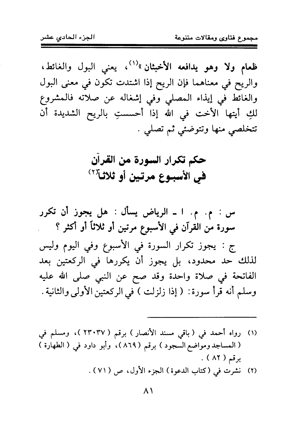 س: م. م. ا- الرياض يسأل: هل يجوز أن تكرر سورة من القرآن في الأسبوع مرتين أو ثلاثا أو أكثر؟ .