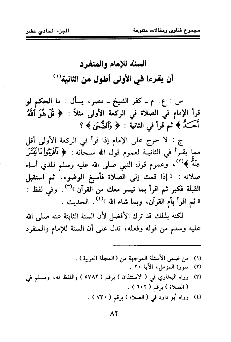ج: لا حرج على الإمام إذا قرأ في الركعة الأولى أقل مما يقرأ في الثانية لعموم قول الله سبحانه: {فَاقْرَءُوا مَا تَيَسَّرَ مِنْهُ} (¬3) وعموم قول النبي صلى الله عليه وسلم للذي أساء صلاته: «إذا قمت إلى الصلاة فاسبغ الوضوء ثم استقبل القبلة فكبر ثم اقرأ بما تيسر معك من القرآن (¬4) » . وفي لفظ: «ثم اقرأ بأم القرآن وبما شاء الله (¬5) » . الحديث.