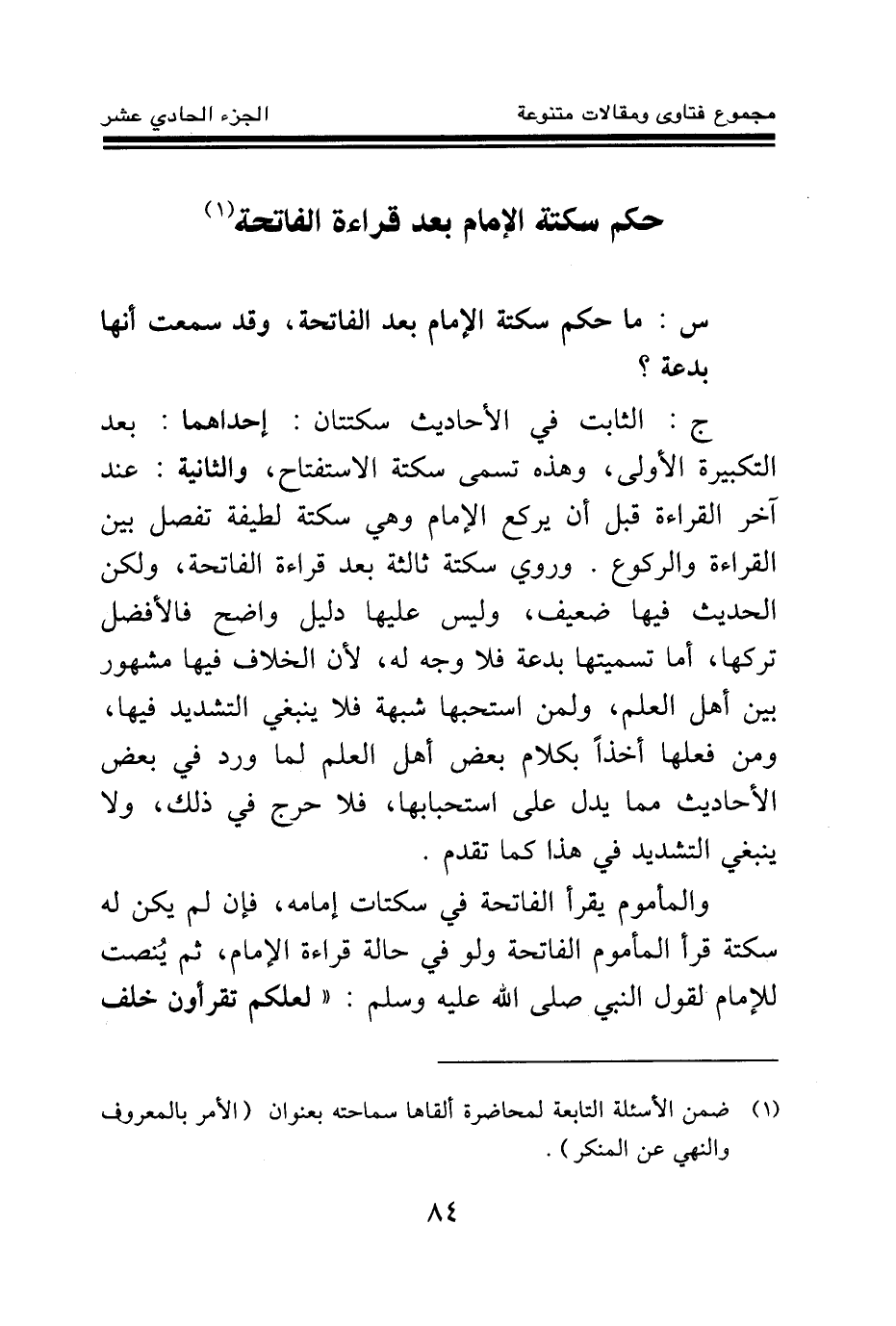 ج: الثابت في الأحاديث سكتتان: إحداهما: بعد التكبيرة الأولى، وهذه تسمى سكتة الاستفتاح، والثانية: عند آخر القراءة قبل أن يركع الإمام وهي سكتة لطيفة تفصل بين القراءة والركوع. وروي سكتة ثالثة بعد قراءة الفاتحة، ولكن الحديث فيها ضعيف، وليس عليها دليل واضح فالأفضل تركها، أما تسميتها بدعة فلا وجه له؛ لأن الخلاف فيها مشهور بين أهل العلم، ولمن استحبها شبهة فلا ينبغي التشديد فيها، ومن فعلها أخذا بكلام بعض أهل العلم لما ورد في بعض الأحاديث مما يدل على استحبابها، فلا حرج في ذلك، ولا ينبغي التشديد في هذا كما تقدم.