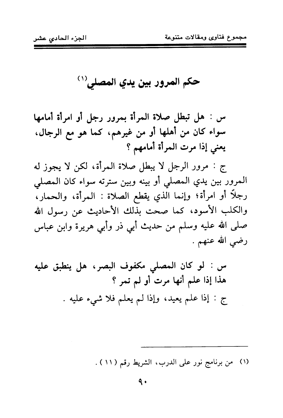 ج: مرور الرجل لا يبطل صلاة المرأة، لكن لا يجوز له المرور بين يدي المصلي أو بينه وبين سترته سواء كان المصلي رجلا أو امرأة؛ وإنما الذي «يقطع الصلاة: المرأة، والحمار، والكلب الأسود (¬1) » ، كما صحت بذلك الأحاديث عن رسول الله صلى الله عليه وسلم من حديث أبي ذر وأبي هريرة وابن عباس رضي الله عنهم.