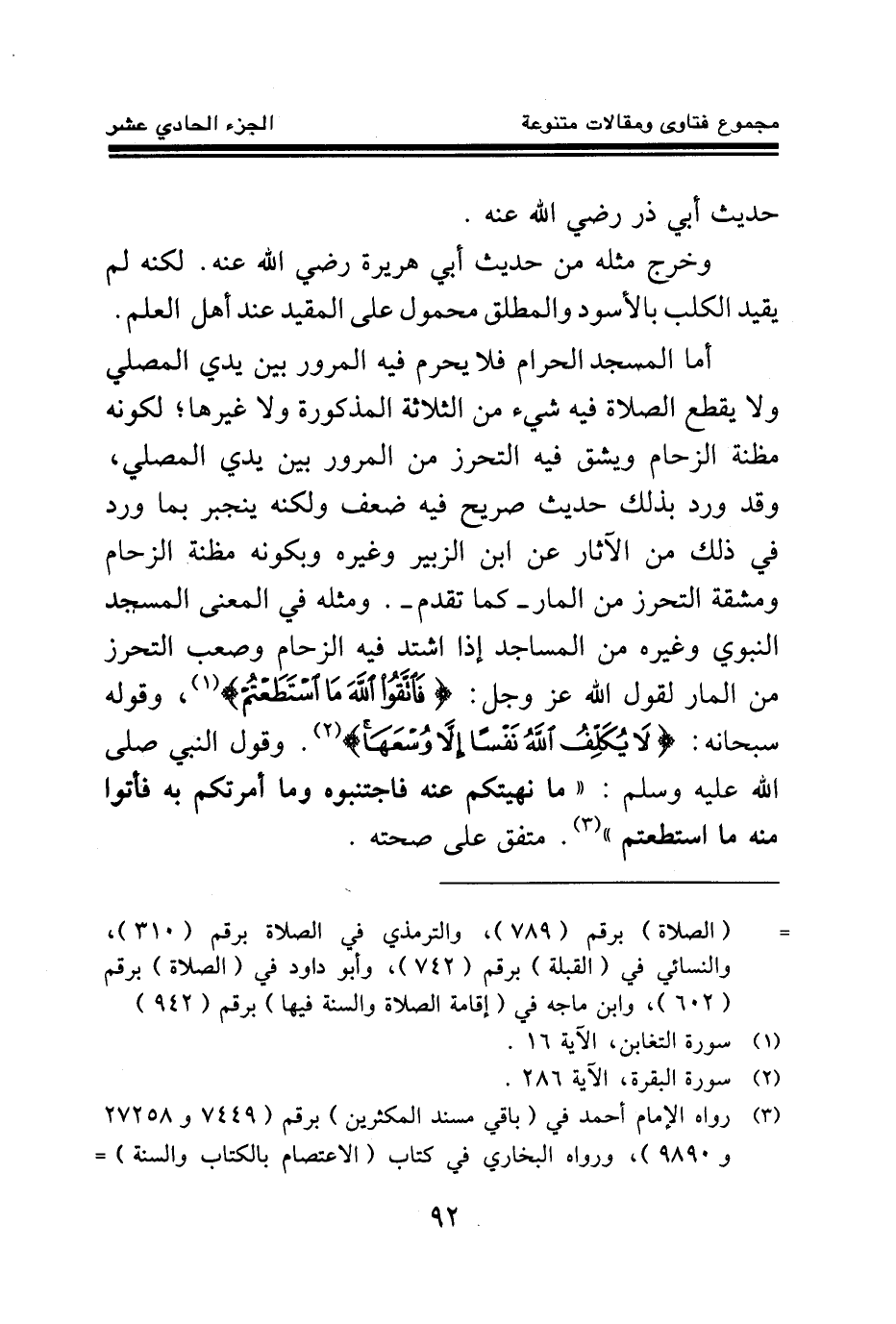 أما المسجد الحرام فلا يحرم فيه المرور بين يدي المصلي ولا يقطع الصلاة فيه شيء من الثلاثة المذكورة ولا غيرها، لكونه مظنة الزحام ويشق فيه التحرز من المرور بين يدي المصلي، وقد ورد بذلك حديث صريح فيه ضعف ولكنه ينجبر بما ورد في ذلك من الآثار عن ابن الزبير وغيره وبكونه مظنة الزحام ومشقة التحرز من المار- كما تقدم- ومثله في المعنى المسجد النبوي وغيره من المساجد إذا اشتد فيه الزحام وصعب التحرز من المار لقول الله عز وجل: {فَاتَّقُوا اللَّهَ مَا اسْتَطَعْتُمْ} (¬1) وقوله سبحانه: {لَا يُكَلِّفُ اللَّهُ نَفْسًا إِلَّا وُسْعَهَا} (¬2) وقول النبي صلى الله عليه وسلم: «ما نهيتكم عنه فاجتنبوه وما أمرتكم به فأتوا منه ما استطعتم (¬3) » متفق على صحته.