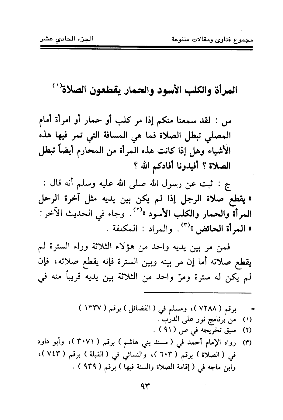 ج: ثبت عن رسول الله صلى الله عليه وسلم أنه قال: «يقطع صلاة الرجل إذا لم يكن بين يديه مثل آخرة الرحل المرأة والحمار والكلب الأسود (¬1) » . وجاء في الحديث الآخر: «المرأة الحائض (¬2) » . والمراد: المكلفة.