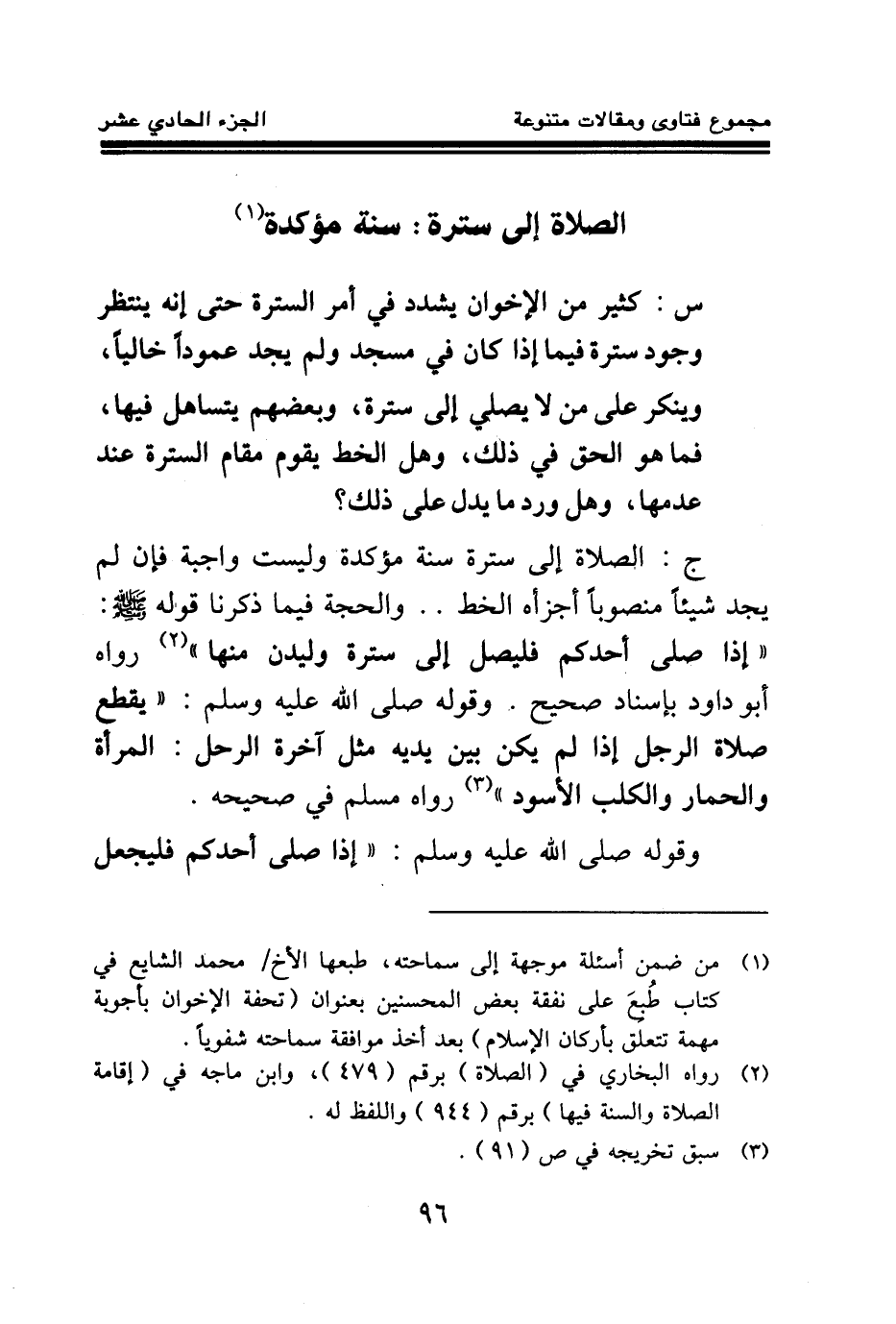 ج: الصلاة إلى سترة سنة مؤكدة وليست واجبة فإن لم يجد شيئا منصوبا أجزأه الخط. والحجة فيما ذكرنا قوله صلى الله عليه وسلم: «إذا صلى أحدكم فليصل إلى سترة وليدن منها (¬1) » . رواه أبو داود بإسناد صحيح. وقوله صلى الله عليه وسلم: «يقطع صلاة الرجل إذا لم يكن بين يديه مثل آخرة الرحل المرأة والحمار والكلب الأسود (¬2) » . رواه مسلم في صحيحه. وقوله صلى الله عليه وسلم: «إذا صلى أحدكم فليجعل