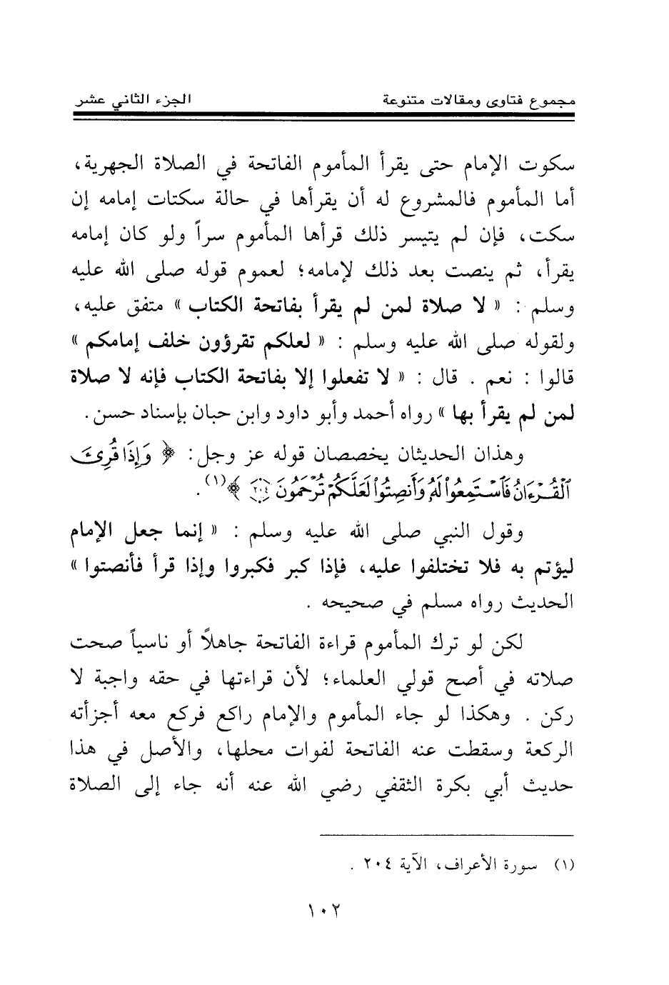 سكوت الإمام حتى يقرأ المأموم الفاتحة في الصلاة الجهرية، أما المأموم فالمشروع له أن يقرأها في حالة سكتات إمامه إن سكت، فإن لم يتيسر ذلك قرأها المأموم سرا ولو كان إمامه يقرأ، ثم ينصت بعد ذلك لإمامه؛ لعموم قوله صلى الله عليه وسلم: «لا صلاة لمن لم يقرأ بفاتحة الكتاب (¬1) » متفق عليه، ولقوله صلى الله عليه وسلم: «لعلكم تقرءون خلف إمامكم قالوا: نعم. قال: لا تفعلوا إلا بفاتحة الكتاب فإنه لا صلاة لمن لم يقرأ بها (¬2) » رواه أحمد وأبو داود وابن حبان بإسناد حسن.