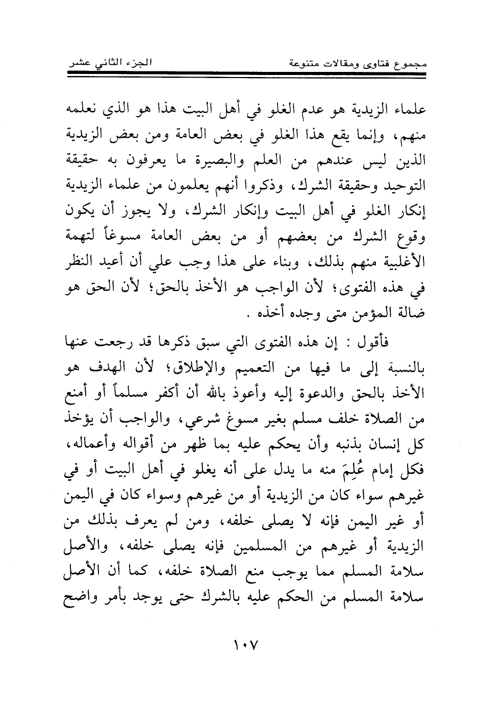 علماء الزيدية هو عدم الغلو في أهل البيت هذا هو الذي نعلمه منهم، وإنما يقع هذا الغلو في بعض العامة ومن بعض الزيدية الذين ليس عندهم من العلم والبصيرة ما يعرفون به حقيقة التوحيد وحقيقة الشرك، وذكروا أنهم يعلمون من علماء الزيدية إنكار الغلو في أهل البيت وإنكار الشرك، ولا يجوز أن يكون وقوع الشرك من بعضهم أو من بعض العامة مسوغا لتهمة الأغلبية منهم بذلك، وبناء على هذا وجب علي أن أعيد النظر في هذه الفتوى؛ لأن الواجب هو الأخذ بالحق؛ لأن الحق هو ضالة المؤمن متى وجده أخذه.