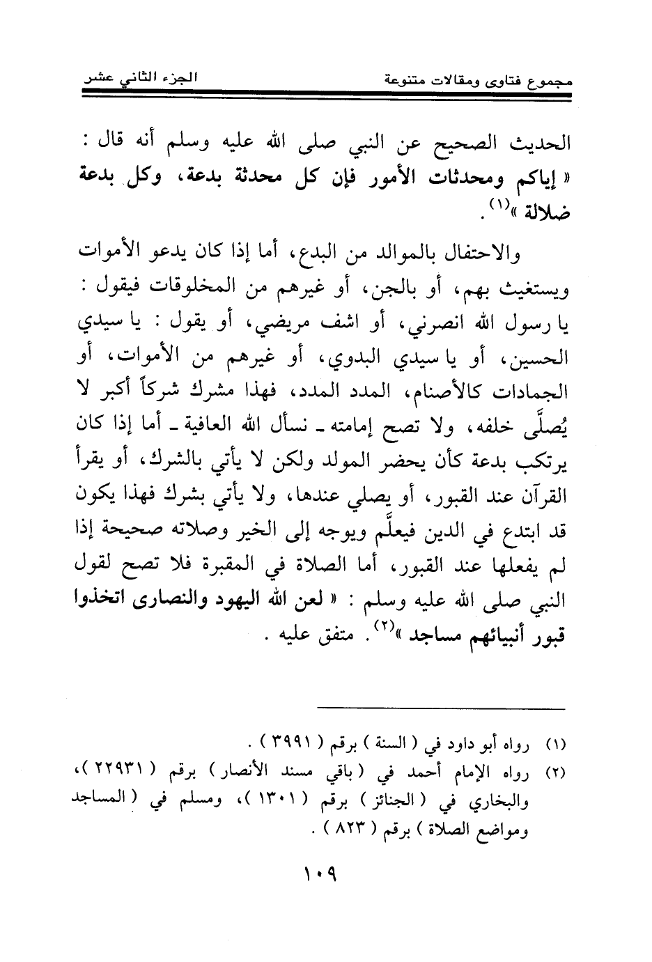 الحديث الصحيح عن النبي صلى الله عليه وسلم أنه قال: «إياكم ومحدثات الأمور فإن كل محدثة بدعة وكل بدعة ضلالة (¬1) »