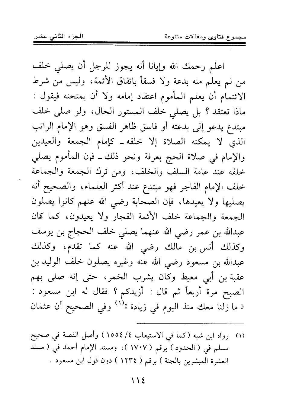 فإن الصحابة رضي الله عنهم كانوا يصلون الجمعة والجماعة خلف الأئمة الفجار ولا يعيدون، كما كان عبد الله بن عمر رضي الله عنهما يصلي خلف الحجاج بن يوسف وكذلك أنس بن مالك رضي الله عنه كما تقدم، وكذلك عبد الله بن مسعود رضي الله عنه وغيره يصلون خلف الوليد بن عقبة بن أبي معيط وكان يشرب الخمر، حتى إنه صلى بهم الصبح مرة أربعا ثم قال: أزيدكم؟ فقال له ابن مسعود: " ما زلنا معك منذ اليوم في زيادة " وفي الصحيح أن عثمان