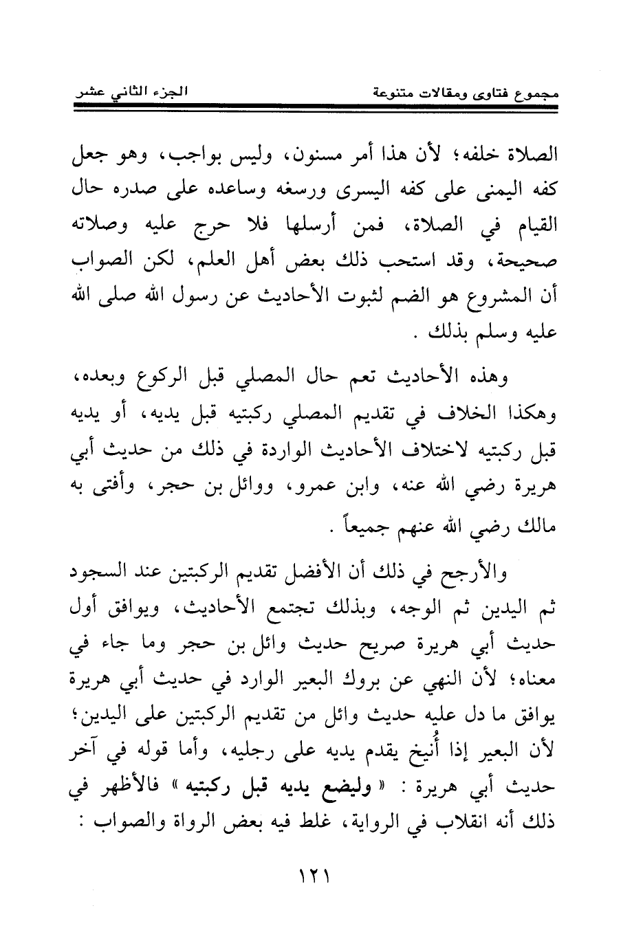 وهذه الأحاديث تعم حال المصلي قبل الركوع وبعده، وهكذا الخلاف في تقديم المصلي ركبتيه قبل يديه، أو يديه قبل ركبتيه لاختلاف الأحاديث الواردة في ذلك من حديث أبي هريرة رضي الله عنه، وابن عمرو، ووائل بن حجر، وأفتى به مالك رضي الله عنهم جميعا.