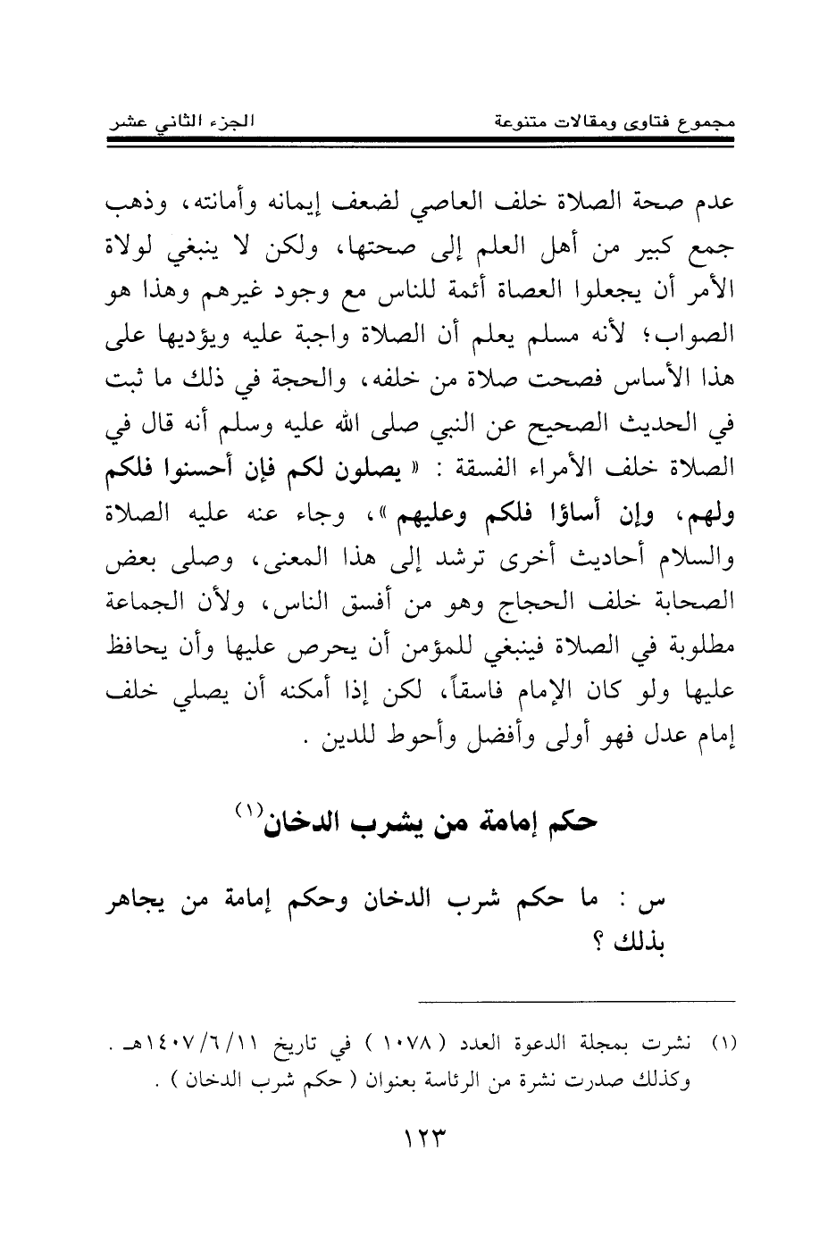 عدم صحة الصلاة خلف العاصي لضعف إيمانه وأمانته، وذهب جمع كبير من أهل العلم إلى صحتها، ولكن لا ينبغي لولاة الأمر أن يجعلوا العصاة أئمة للناس مع وجود غيرهم وهذا هو الصواب؛ لأنه مسلم يعلم أن الصلاة واجبة عليه ويؤديها على هذا الأساس فصحت صلاة من خلفه، والحجة في ذلك ما ثبت في الحديث الصحيح عن النبي صلى الله عليه وسلم أنه قال في الصلاة خلف الأمراء الفسقة: «يصلون لكم فإن أحسنوا فلكم ولهم وإن أساءوا فلكم وعليهم (¬1) » ، وجاء عنه عليه الصلاة والسلام أحاديث أخرى ترشد إلى هذا المعنى، وصلى بعض الصحابة خلف الحجاج وهو من أفسق الناس، ولأن الجماعة مطلوبة في الصلاة فينبغي للمؤمن أن يحرص عليها وأن يحافظ عليها ولو كان الإمام فاسقا، لكن إذا أمكنه أن يصلي خلف إمام عدل فهو أولى وأفضل وأحوط للدين.