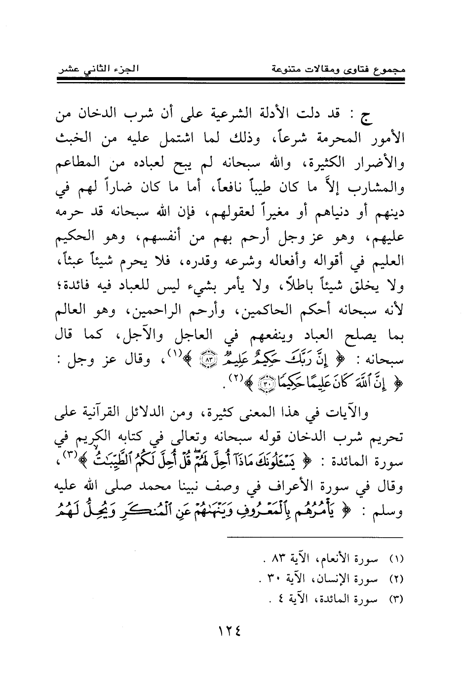 ج: قد دلت الأدلة الشرعية على أن شرب الدخان من الأمور المحرمة شرعا، وذلك لما اشتمل عليه من الخبث والأضرار الكثيرة، والله سبحانه لم يبح لعباده من المطاعم والمشارب إلا ما كان طيبا نافعا، أما ما كان ضارا لهم في دينهم أو دنياهم أو مغيرا لعقولهم، فإن الله سبحانه قد حرمه عليهم، وهو عز وجل أرحم بهم من أنفسهم، وهو الحكيم العليم في أقواله وأفعاله وشرعه وقدره، فلا يحرم شيئا عبثا، ولا يخلق شيئا باطلا، ولا يأمر بشيء ليس للعباد فيه فائدة؛ لأنه سبحانه أحكم الحاكمين، وأرحم الراحمين، وهو العالم بما يصلح العباد وينفعهم في العاجل والآجل، كما قال سبحانه: {إِنَّ رَبَّكَ حَكِيمٌ عَلِيمٌ} (¬1) وقال عز وجل: {إِنَّ اللَّهَ كَانَ عَلِيمًا حَكِيمًا} (¬2)