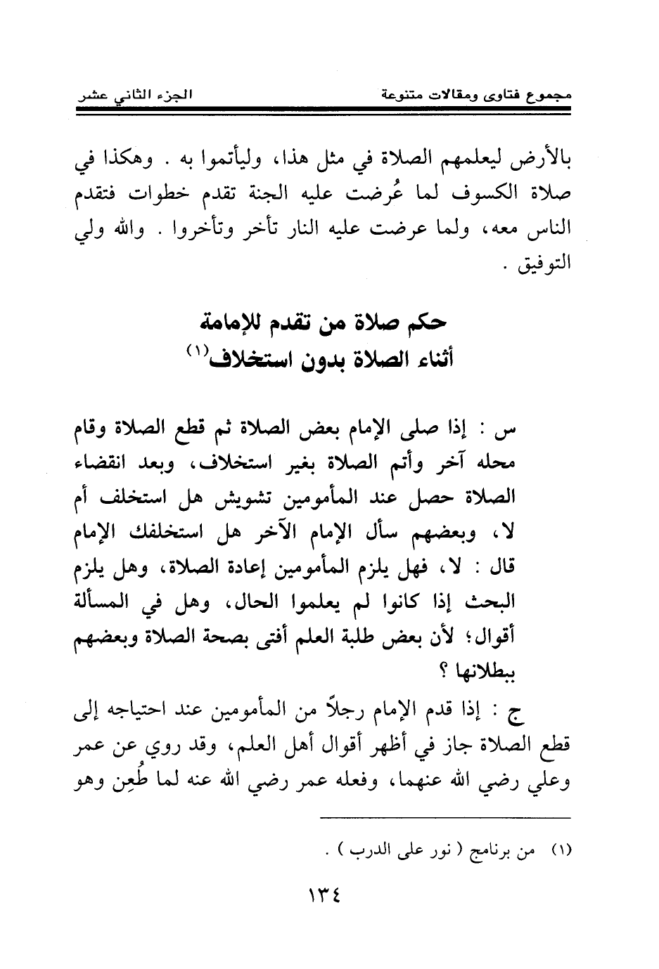 ج: إذا قدم الإمام رجلا من المأمومين عند احتياجه إلى قطع الصلاة جاز في أظهر أقوال أهل العلم، وقد روي عن عمر وعلي رضي الله عنهما، وفعله عمر رضي الله عنه لما طعن وهو