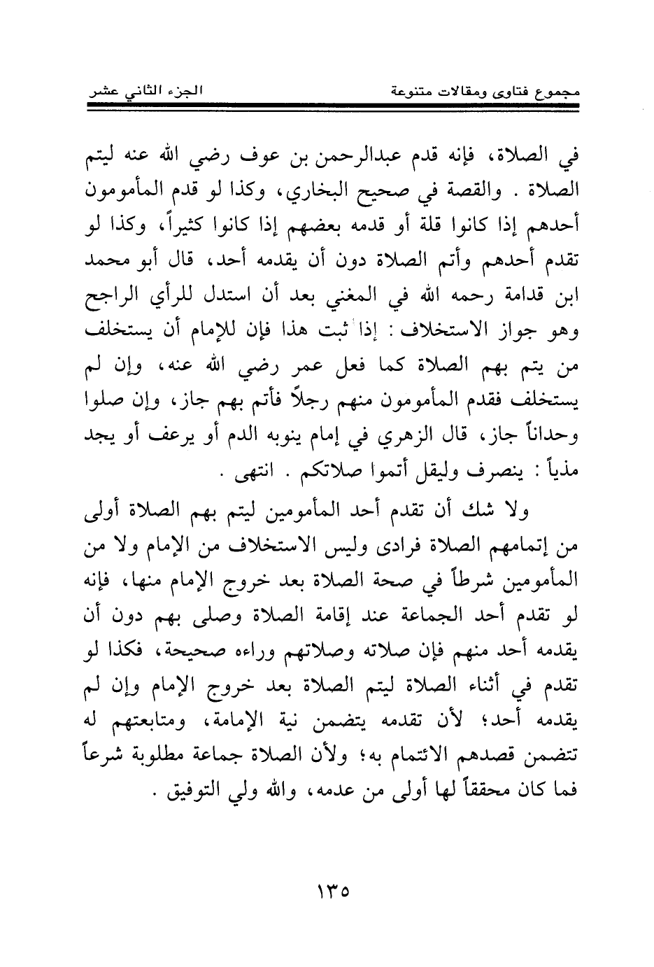ولا شك أن تقدم أحد المأمومين ليتم بهم الصلاة أولى من إتمامهم الصلاة فرادى وليس الاستخلاف من الإمام ولا من المأمومين شرطا في صحة الصلاة بعد خروج الإمام منها، فإنه لو تقدم أحد الجماعة عند إقامة الصلاة وصلى بهم دون أن يقدمه أحد منهم فإن صلاته وصلاتهم وراءه صحيحة، فكذا لو تقدم في أثناء الصلاة ليتم الصلاة بعد خروج الإمام وإن لم يقدمه أحد؛ لأن تقدمه يتضمن نية الإمامة، ومتابعتهم له تتضمن قصدهم الائتمام به، ولأن الصلاة جماعة مطلوبة شرعا فما كان محققا لها أولى من عدمه، والله ولي التوفيق.