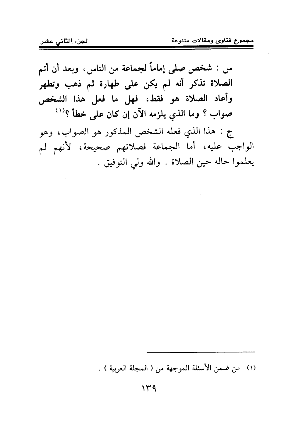 س: شخص صلى إماما لجماعة من الناس، وبعد أن أتم الصلاة تذكر أنه لم يكن على طهارة ثم ذهب وتطهر وأعاد الصلاة هو فقط، فهل ما فعل هذا الشخص صواب؟ وما الذي يلزمه الآن إن كان على خطأ؟ (¬1)