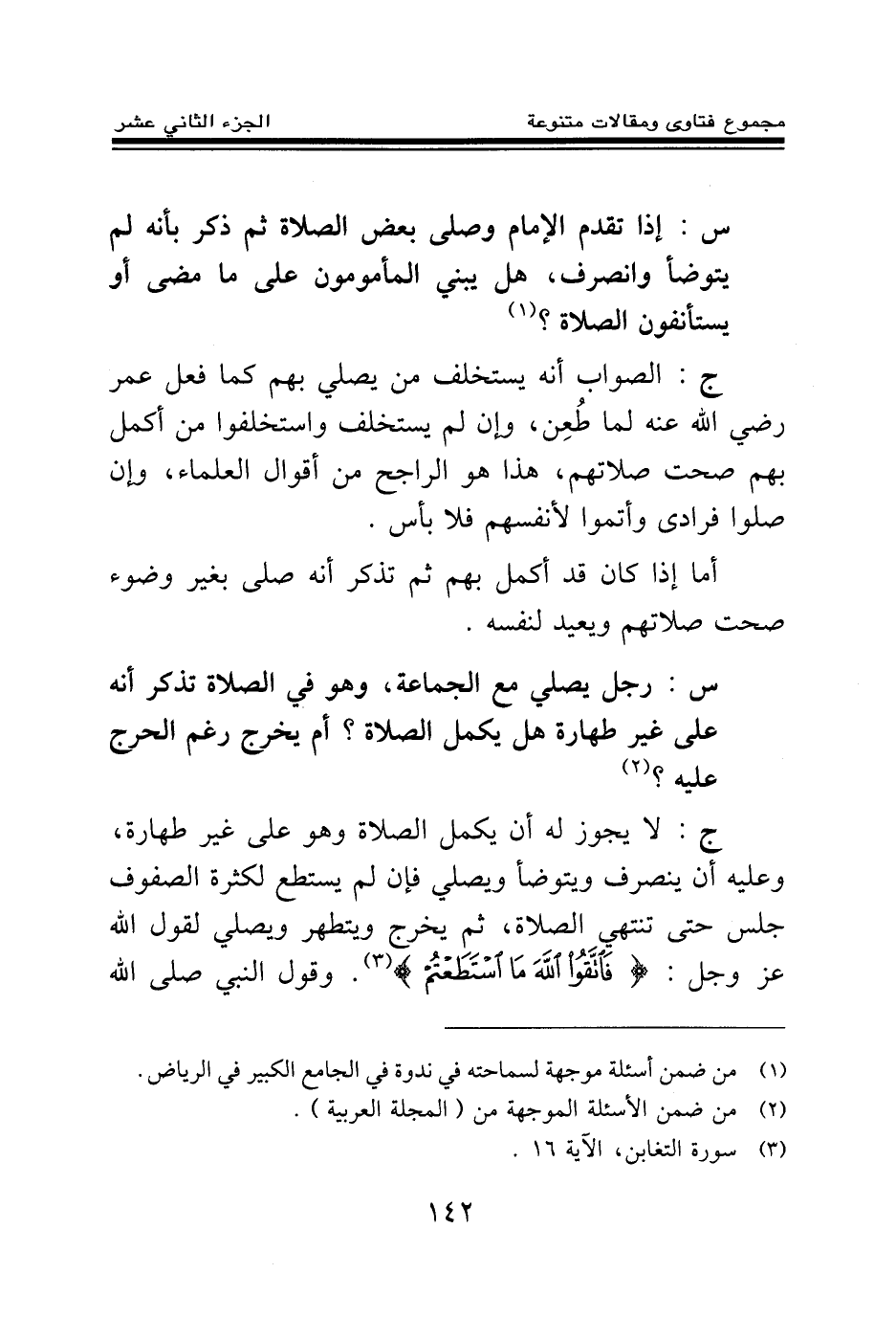 ج: لا يجوز له أن يكمل الصلاة وهو على غير طهارة، وعليه أن ينصرف ويتوضأ ويصلي فإن لم يستطع لكثرة الصفوف جلس حتى تنتهي الصلاة، ثم يخرج ويتطهر ويصلي لقول الله عز وجل: {فَاتَّقُوا اللَّهَ مَا اسْتَطَعْتُمْ} (¬2) وقول النبي صلى الله