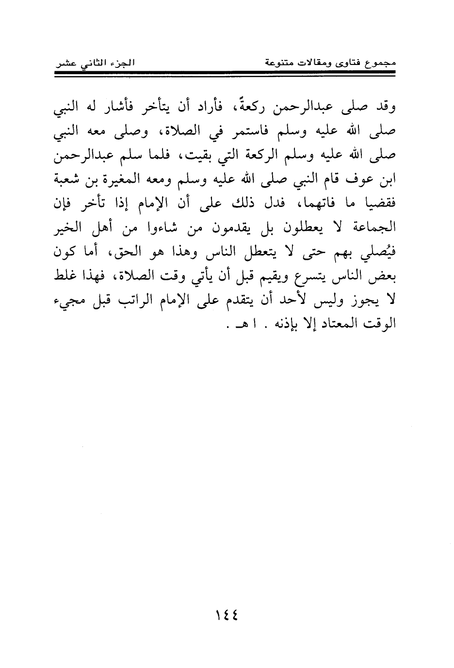 وقد صلى عبد الرحمن ركعة، فأراد أن يتأخر فأشار له النبي صلى الله عليه وسلم فاستمر في الصلاة، وصلى معه النبي صلى الله عليه وسلم الركعة التي بقيت، فلما سلم عبد الرحمن بن عوف قام النبي صلى الله عليه وسلم ومعه المغيرة بن شعبة فقضيا ما فاتهما، فدل ذلك على أن الإمام إذا تأخر فإن الجماعة لا يعطلون بل يقدمون من شاءوا من أهل الخير فيصلي بهم حتى لا يتعطل الناس وهذا هو الحق.