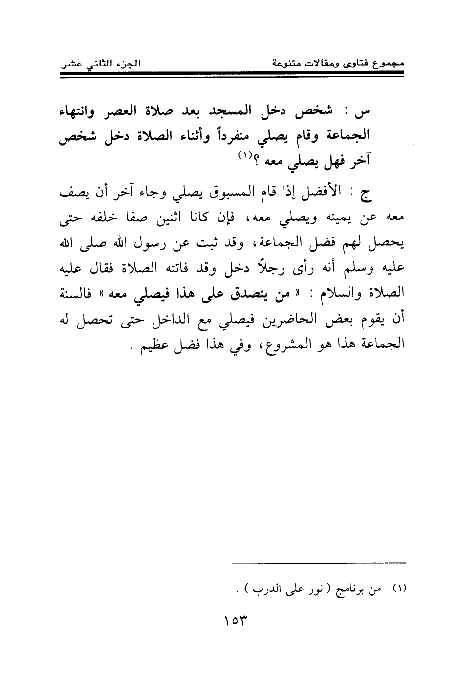 ج: الأفضل إذا قام المسبوق يصلي وجاء آخر أن يصف معه عن يمينه ويصلي معه، فإن كانا اثنين صفا خلفه حتى يحصل لهم فضل الجماعة، وقد ثبت عن رسول الله صلى الله عليه وسلم «أنه رأى رجلا دخل وقد فاتته الصلاة فقال عليه الصلاة والسلام: من يتصدق على هذا فيصلي معه (¬2) » فالسنة أن يقوم بعض الحاضرين فيصلي مع الداخل حتى تحصل له الجماعة هذا هو المشروع، وفي هذا فضل عظيم.