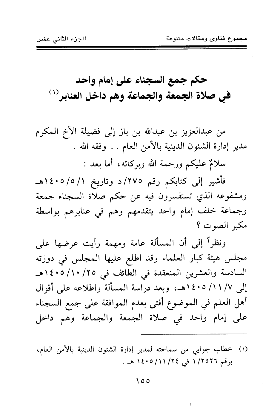 فأشير إلى كتابكم رقم 275 \ د وتاريخ 1 \ 5 \ 1405 هـ ومشفوعه الذي تستفسرون فيه عن حكم صلاة السجناء جمعة وجماعة خلف إمام واحد يتقدمهم وهم في عنابرهم بواسطة مكبر الصوت؟ ونظرا إلى أن المسألة عامة ومهمة رأيت عرضها على مجلس هيئة كبار العلماء وقد اطلع عليها المجلس في دورته السادسة والعشرين المنعقدة في الطائف في 25 \ 10 \ 1405 هـ إلى 7 \ 11 \ 1405 هـ، وبعد دراسة المسألة واطلاعه على أقوال أهل العلم في الموضوع أفتى بعدم الموافقة على جمع السجناء على إمام واحد في صلاة الجمعة والجماعة وهم داخل