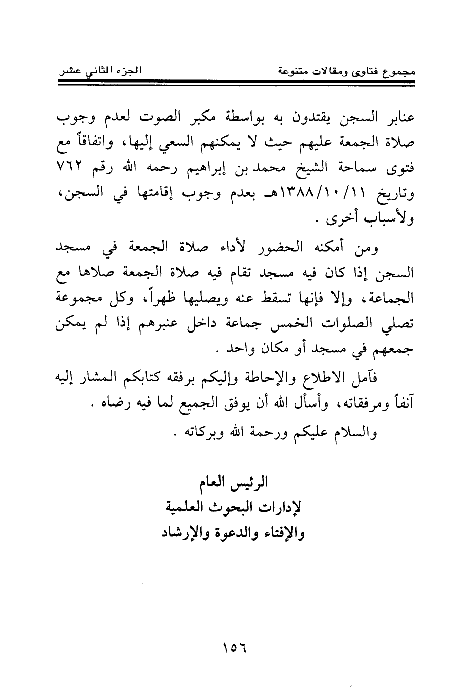 عنابر السجن يقتدون به بواسطة مكبر الصوت لعدم وجوب صلاة الجمعة عليهم حيث لا يمكنهم السعي إليها، واتفاقا مع فتوى سماحة الشيخ محمد بن إبراهيم رحمه الله رقم 762 وتاريخ 11 \ 10 \ 1388 هـ بعدم وجوب إقامتها في السجن، ولأسباب أخرى. ومن أمكنه الحضور لأداء صلاة الجمعة في مسجد السجن إذا كان فيه مسجد تقام فيه صلاة الجمعة صلاها مع الجماعة، وإلا فإنها تسقط عنه ويصليها ظهرا، وكل مجموعة تصلي الصلوات الخمس جماعة داخل عنبرهم إذا لم يمكن جمعهم في مسجد أو مكان واحد.