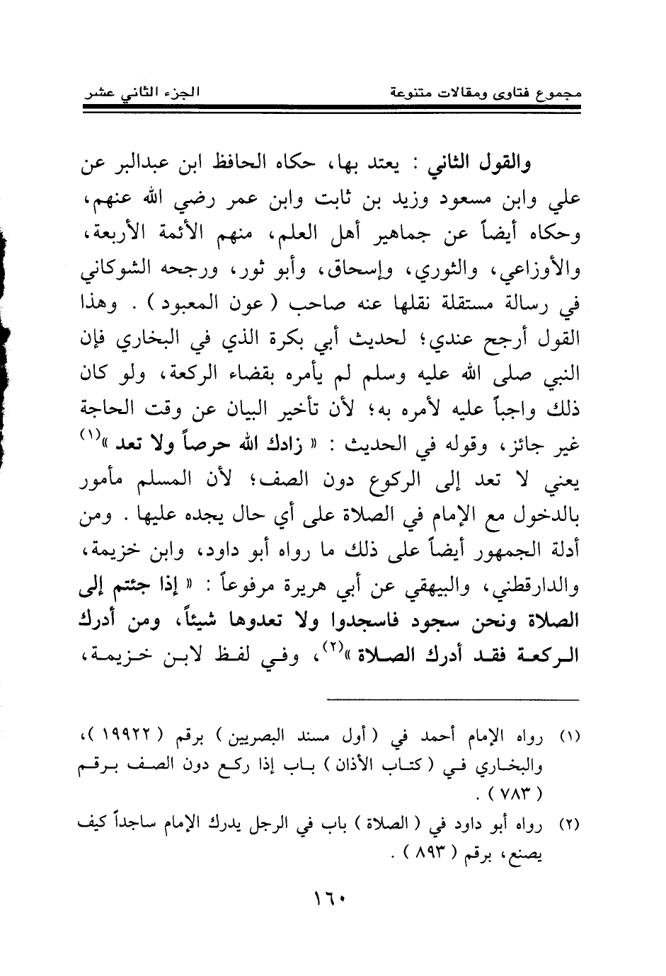والقول الثاني: يعتد بها، حكاه الحافظ ابن عبد البر عن علي وابن مسعود وزيد بن ثابت وابن عمر رضي الله عنهم، وحكاه أيضا عن جماهير أهل العلم، منهم الأئمة الأربعة، والأوزاعي، والثوري، وإسحاق، وأبو ثور، ورجحه الشوكاني في رسالة مستقلة نقلها عنه صاحب (عون المعبود) . وهذا القول أرجح عندي؛ لحديث أبي بكرة الذي في البخاري فإن النبي صلى الله عليه وسلم لم يأمره بقضاء الركعة، ولو كان ذلك واجبا عليه لأمره به؛ لأن تأخير البيان عن وقت الحاجة غير جائز، وقوله في الحديث: «زادك الله حرصا ولا تعد (¬1) » يعني لا تعد إلى الركوع دون الصف؛ لأن المسلم مأمور بالدخول مع الإمام في الصلاة على أي حال يجده عليها. ومن أدلة الجمهور أيضا على ذلك ما رواه أبو داود، وابن خزيمة، والدارقطني، والبيهقي عن أبي هريرة مرفوعا: «إذا جئتم إلى الصلاة ونحن سجود فاسجدوا ولا تعدوها شيئا ومن أدرك الركعة فقد أدرك الصلاة (¬2) » ، وفي لفظ لابن خزيمة،