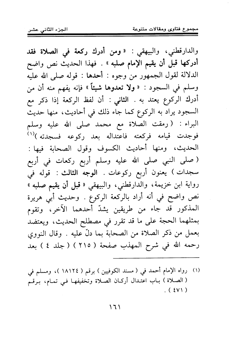 والدارقطني، والبيهقي: «ومن أدرك ركعة في الصلاة فقد أدركها قبل أن يقيم الإمام صلبه (¬1) » . فهذا الحديث نص واضح الدلالة لقول الجمهور من وجوه: أحدها: قوله صلى الله عليه وسلم في السجود: ولا تعدوها شيئا فإنه يفهم منه أن من أدرك الركوع يعتد به. الثاني: أن لفظ الركعة إذا ذكر مع السجود يراد به الركوع كما جاء ذلك في أحاديث، منها حديث البراء: «رمقت الصلاة مع محمد صلى الله عليه وسلم فوجدت قيامه فركعته فاعتداله بعد ركوعه فسجدته (¬2) » الحديث، ومنها أحاديث الكسوف وقول الصحابة فيها: «صلى النبي صلى الله عليه وسلم أربع ركعات في أربع سجدات (¬3) » يعنون أربع ركوعات. الوجه الثالث: قوله في رواية ابن خزيمة، والدارقطني، والبيهقي «قبل أن يقيم صلبه» نص واضح في أنه أراد بالركعة الركوع. وحديث أبي هريرة المذكور قد جاء من طريقين يشد أحدهما الآخر، وتقوم بمثلهما الحجة على ما قد تقرر في مصطلح الحديث، ويعتضد بعمل من ذكر الصلاة من الصحابة بما دل عليه. وقال النووي رحمه الله في شرح المهذب صفحة (215) (جلد 4) بعد