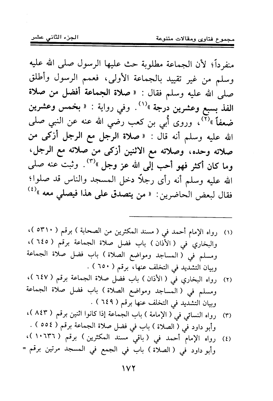 (¬2) رواه البخاري في (الأذان) باب فضل صلاة الجماعة (647) ، ومسلم في (المساجد ومواضع الصلاة) باب فضل صلاة الجماعة وبيان التشديد في التخلف عنها برقم (650) .