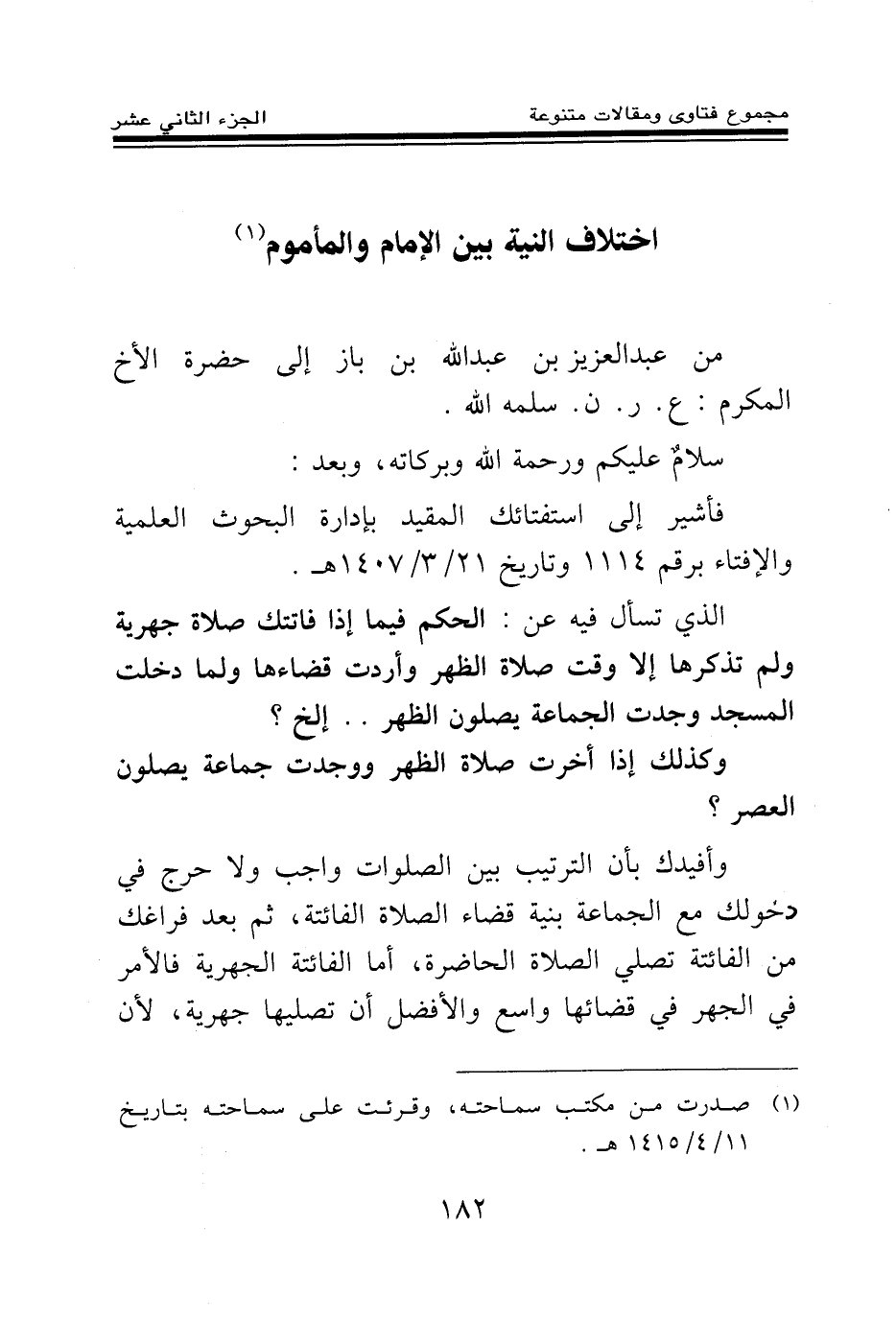 فأشير إلى استفتائك المقيد بإدارة البحوث العلمية والإفتاء برقم 1114 وتاريخ 21 \ 3 \ 1407 هـ. الذي تسأل فيه عن: الحكم فيما إذا فاتتك صلاة جهرية ولم تذكرها إلا وقت صلاة الظهر وأردت قضاءها ولما دخلت المسجد وجدت الجماعة يصلون الظهر. إلخ؟ وكذلك إذا أخرت صلاة الظهر ووجدت جماعة يصلون العصر؟