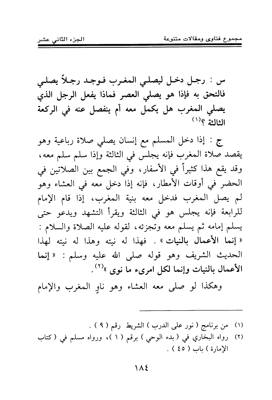 ج: إذا دخل المسلم مع إنسان يصلي صلاة رباعية وهو يقصد صلاة المغرب فإنه يجلس في الثالثة وإذا سلم سلم معه، وقد يقع هذا كثيرا في الأسفار، وفي الجمع بين الصلاتين في الحضر في أوقات الأمطار، فإنه إذا دخل معه في العشاء وهو لم يصل المغرب فدخل معه بنية المغرب، إذا قام الإمام للرابعة فإنه يجلس هو في الثالثة ويقرأ التشهد ويدعو حتى يسلم إمامه ثم يسلم معه وتجزئه، لقوله عليه الصلاة والسلام: «إنما الأعمال بالنيات (¬2) » فهذا له نيته وهذا له نيته لهذا الحديث الشريف وهو قوله صلى الله عليه وسلم: «إنما الأعمال بالنيات وإنما لكل امرئ ما نوى (¬3) » .