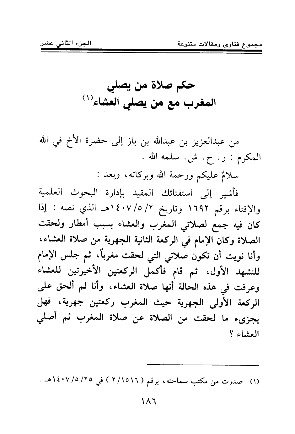 من عبد العزيز بن عبد الله بن باز إلى حضرة الأخ في الله المكرم: ر. ح. ش. سلمه الله. سلام عليكم ورحمة الله وبركاته، وبعد: