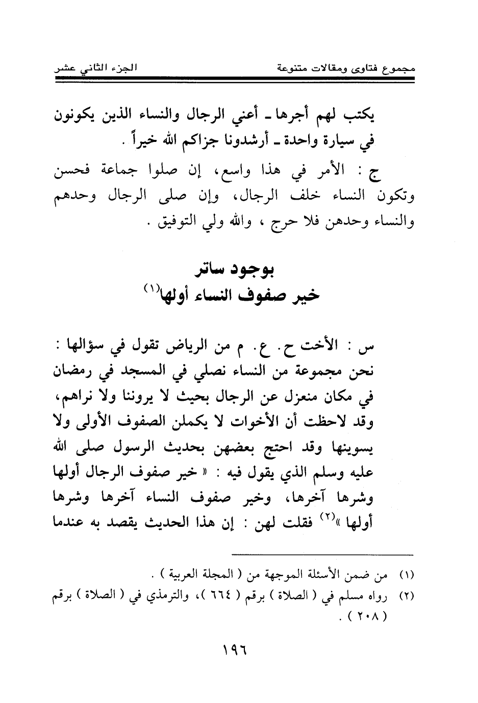 س: الأخت ج. ع. م من الرياض تقول في سؤالها: نحن مجموعة من النساء نصلي في المسجد في رمضان في مكان منعزل عن الرجال بحيث لا يروننا ولا نراهم، وقد لاحظت أن الأخوات لا يكملن الصفوف الأولى ولا يسوينها وقد احتج بعضهن بحديث الرسول صلى الله عليه وسلم الذي يقول فيه: «خير صفوف الرجال أولها وشرها آخرها وخير صفوف النساء آخرها وشرها أولها (¬2) » فقلت لهن: إن هذا الحديث يقصد به عندما