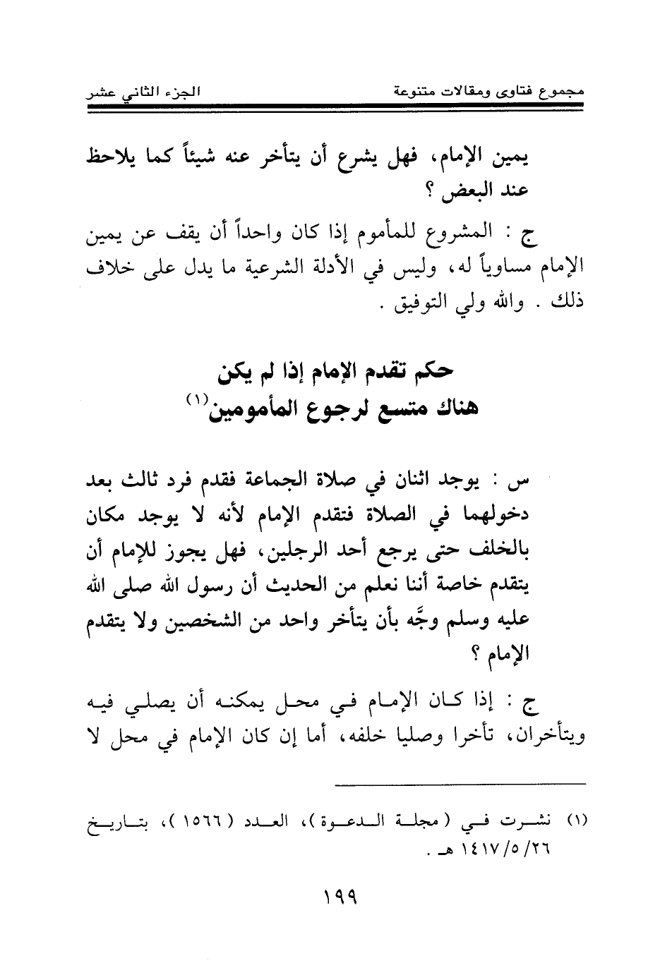 س: يوجد اثنان في صلاة الجماعة فقدم فرد ثالث بعد دخولهما في الصلاة فتقدم الإمام لأنه لا يوجد مكان بالخلف حتى يرجع أحد الرجلين، فهل يجوز للإمام أن يتقدم خاصة أننا نعلم من الحديث أن رسول الله صلى الله عليه وسلم وجه بأن يتأخر واحد من الشخصين ولا يتقدم الإمام؟