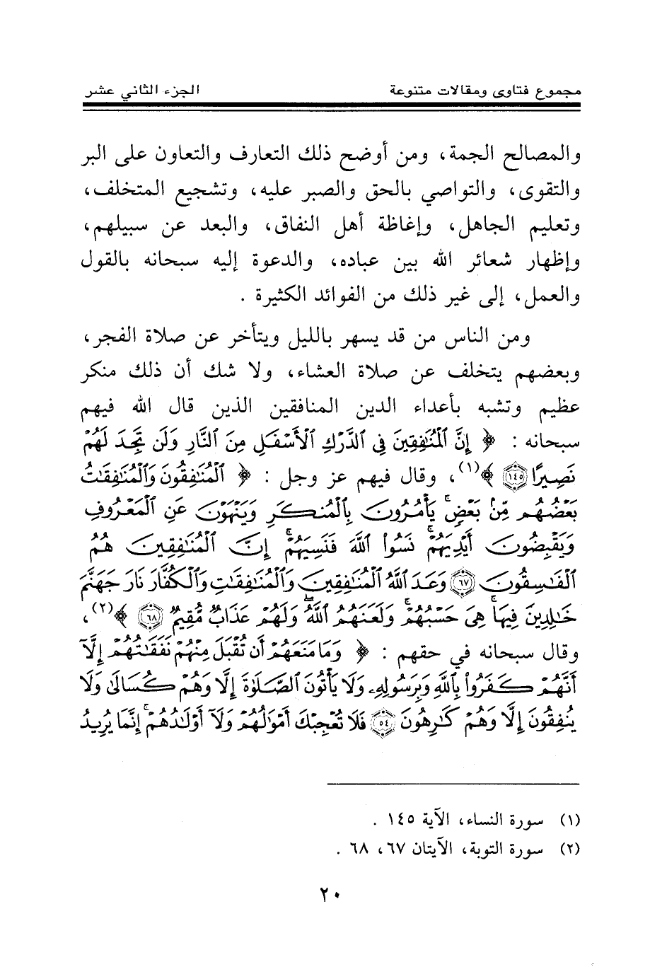 ومن الناس من قد يسهر بالليل ويتأخر عن صلاة الفجر، وبعضهم يتخلف عن صلاة العشاء، ولا شك أن ذلك منكر عظيم وتشبه بأعداء الدين المنافقين الذين قال الله فيهم سبحانه: {إِنَّ الْمُنَافِقِينَ فِي الدَّرْكِ الْأَسْفَلِ مِنَ النَّارِ وَلَنْ تَجِدَ لَهُمْ نَصِيرًا} (¬1) وقال فيهم عز وجل {الْمُنَافِقُونَ وَالْمُنَافِقَاتُ بَعْضُهُمْ مِنْ بَعْضٍ يَأْمُرُونَ بِالْمُنْكَرِ وَيَنْهَوْنَ عَنِ الْمَعْرُوفِ وَيَقْبِضُونَ أَيْدِيَهُمْ نَسُوا اللَّهَ فَنَسِيَهُمْ إِنَّ الْمُنَافِقِينَ هُمُ الْفَاسِقُونَ} (¬2) {وَعَدَ اللَّهُ الْمُنَافِقِينَ وَالْمُنَافِقَاتِ وَالْكُفَّارَ نَارَ جَهَنَّمَ خَالِدِينَ فِيهَا هِيَ حَسْبُهُمْ وَلَعَنَهُمُ اللَّهُ وَلَهُمْ عَذَابٌ مُقِيمٌ} (¬3) وقال سبحانه في حقهم: {وَمَا مَنَعَهُمْ أَنْ تُقْبَلَ مِنْهُمْ نَفَقَاتُهُمْ إِلَّا أَنَّهُمْ كَفَرُوا بِاللَّهِ وَبِرَسُولِهِ وَلَا يَأْتُونَ الصَّلَاةَ إِلَّا وَهُمْ كُسَالَى وَلَا يُنْفِقُونَ إِلَّا وَهُمْ كَارِهُونَ} (¬4) {فَلَا تُعْجِبْكَ أَمْوَالُهُمْ وَلَا أَوْلَادُهُمْ إِنَّمَا يُرِيدُ اللَّهُ لِيُعَذِّبَهُمْ بِهَا فِي الْحَيَاةِ الدُّنْيَا وَتَزْهَقَ أَنْفُسُهُمْ وَهُمْ كَافِرُونَ} (¬5)