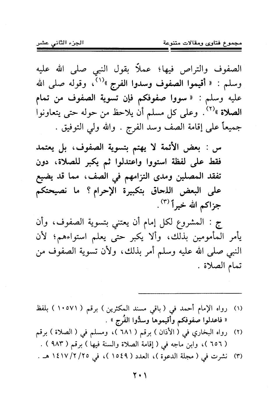 الصفوف والتراص فيها. عملا بقول النبي صلى الله عليه وسلم: «أقيموا الصفوف وسدوا الفرج (¬1) » ، وقوله صلى الله عليه وسلم: «سووا صفوفكم فإن تسوية الصفوف من تمام الصلاة (¬2) » . وعلى كل مسلم أن يلاحظ من حوله حتى يتعاونوا جميعا على إقامة الصف وسد الفرج. والله ولي التوفيق.