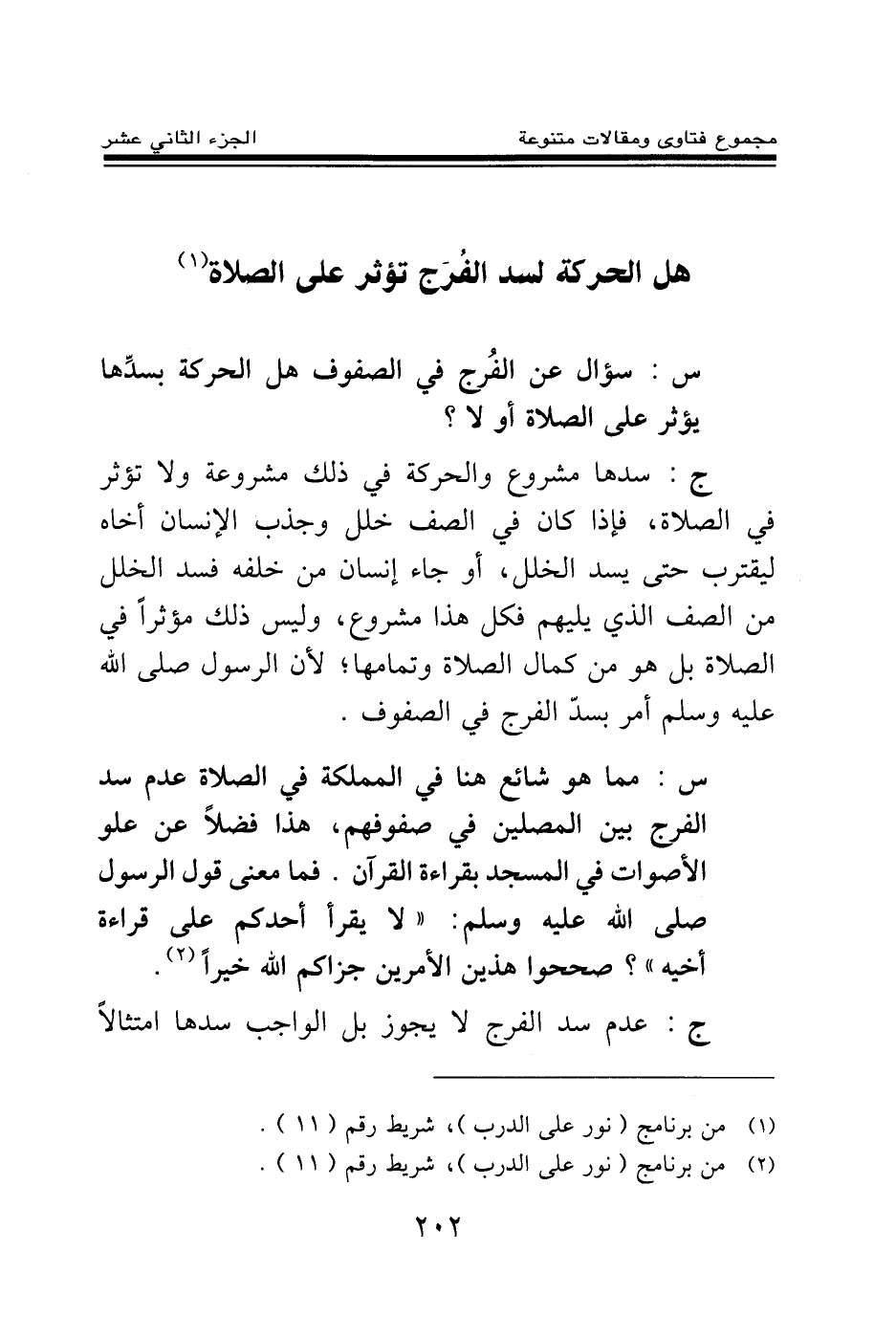 س: مما هو شائع هنا في المملكة في الصلاة عدم سد الفرج بين المصلين في صفوفهم، هذا فضلا عن علو الأصوات في المسجد بقراءة القرآن. فهل معنى قول الرسول صلى الله عليه وسلم: «لا يقرأ أحدكم على قراءة أخيه» ؟ صححوا هذين الأمرين جزاكم الله خيرا (¬1) .