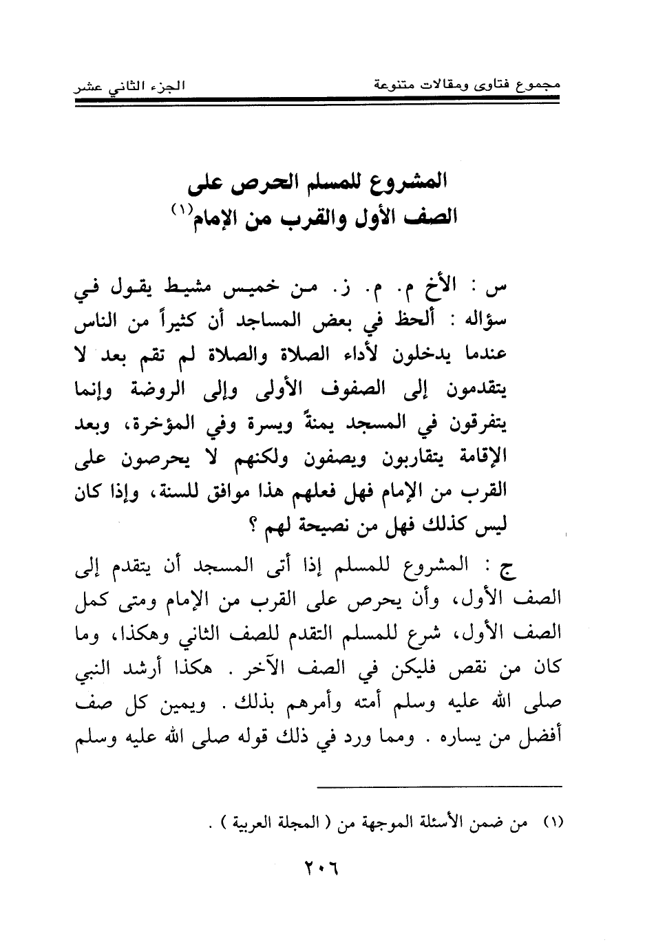 س: الأخ م. م. ز. من خميس مشيط يقول في سؤاله: ألحظ في بعض المساجد أن كثيرا من الناس عندما يدخلون لأداء الصلاة والصلاة لم تقم بعد لا يتقدمون إلى الصفوف الأولى وإلى الروضة وإنما يتفرقون في المسجد يمنة ويسرة وفي المؤخرة، وبعد الإقامة يتقاربون ويصفون ولكنهم لا يحرصون على القرب من الإمام فهل فعلهم هذا موافق للسنة، وإذا كان ليس كذلك فهل من نصيحة لهم؟
