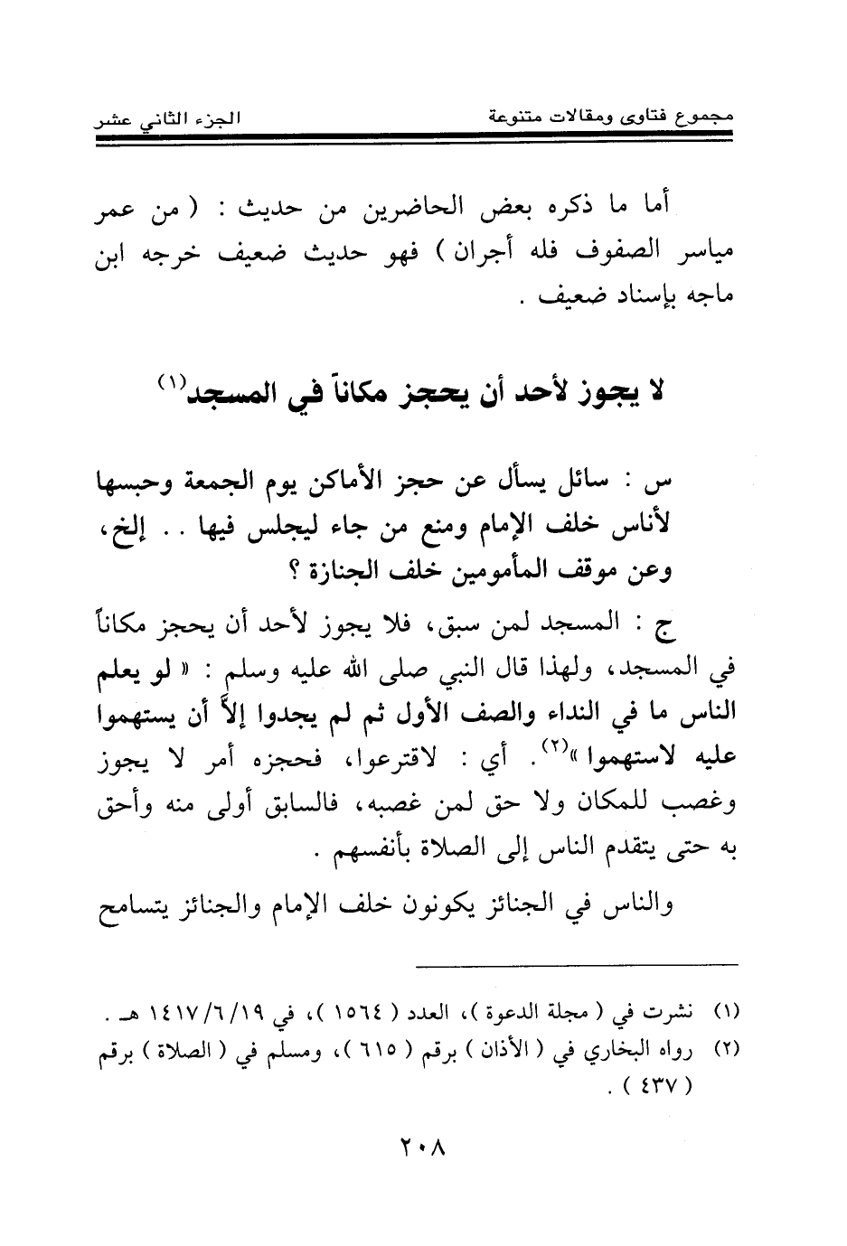 ج: المسجد لمن سبق، فلا يجوز لأحد أن يحجز مكانا في المسجد، ولهذا قال النبي صلى الله عليه وسلم: «لو يعلم الناس ما في النداء والصف الأول ثم لم يجدوا إلا أن يستهموا عليه لاستهموا (¬2) » أي: لاقترعوا، فحجزه أمر لا يجوز وغصب للمكان ولا حق لمن غصبه، فالسابق أولى منه وأحق به حتى يتقدم الناس إلى الصلاة بأنفسهم.