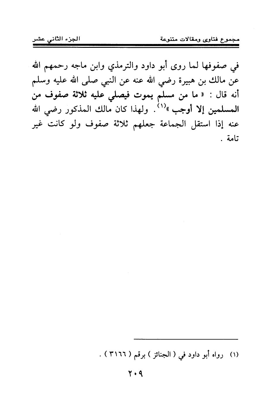 في صفوفها لما روى أبو داود والترمذي وابن ماجه رحمهم الله عن مالك بن هبيرة رضي الله عنه عن النبي صلى الله عليه وسلم أنه قال: «ما من مسلم يموت فيصلي عليه ثلاثة صفوف من المسلمين إلا أوجب (¬1) » . ولهذا كان مالك المذكور رضي الله عنه إذا استقل الجماعة جعلهم ثلاثة صفوف ولو كانت غير تامة.