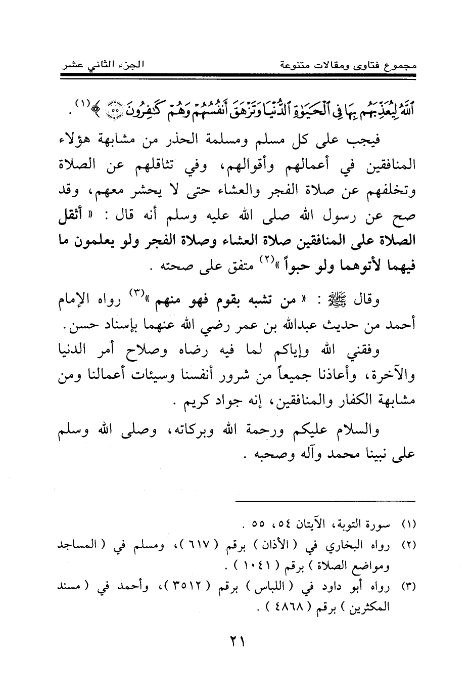فيجب على كل مسلم ومسلمة الحذر من مشابهة هؤلاء المنافقين في أعمالهم وأقوالهم، وفي تثاقلهم عن الصلاة وتخلفهم عن صلاة الفجر والعشاء حتى لا يحشر معهم، وقد صح عن رسول الله صلى الله عليه وسلم أنه قال: «أثقل الصلاة على المنافقين صلاة العشاء وصلاة الفجر ولو يعلمون ما فيهما لأتوهما ولو حبوا (¬1) » متفق على صحته.