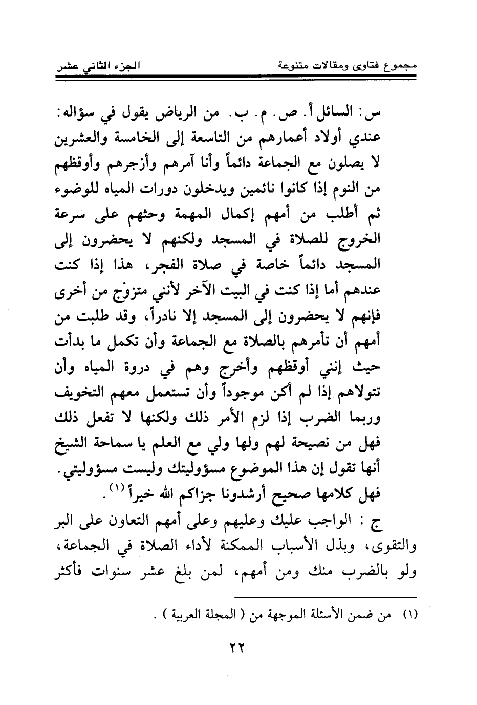 س: السائل أ. ص. م. ب. من الرياض يقول في سؤاله: عندي أولاد أعمارهم من التاسعة إلى الخامسة والعشرين لا يصلون مع الجماعة دائما وأنا آمرهم وأزجرهم وأوقظهم من النوم إذا كانوا نائمين ويدخلون دورات المياه للوضوء ثم أطلب من أمهم إكمال المهمة وحثهم على سرعة الخروج للصلاة في المسجد ولكنهم لا يحضرون إلى المسجد دائما خاصة في صلاة الفجر، هذا إذا كنت عندهم أما إذا كنت في البيت الآخر لأنني متزوج من أخرى فإنهم لا يحضرون إلى المسجد إلا نادرا، وقد طلبت من أمهم أن تأمرهم بالصلاة مع الجماعة وأن تكمل ما بدأت حيث إنني أوقظهم وأخرج وهم في دورة المياه وأن تتولاهم إذا لم أكن موجودا وأن تستعمل معهم التخويف وربما الضرب إذا لزم الأمر ذلك ولكنها لا تفعل ذلك فهل من نصيحة لهم ولها ولي مع العلم يا سماحة الشيخ أنها تقول: إن هذا الموضوع مسئوليتك وليست مسئوليتي. فهل كلامها صحيح أرشدونا جزاكم الله خيرا (¬1) .