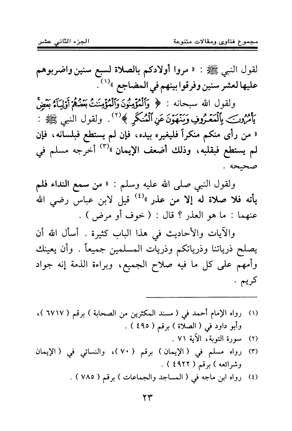 ولقول الله سبحانه: {وَالْمُؤْمِنُونَ وَالْمُؤْمِنَاتُ بَعْضُهُمْ أَوْلِيَاءُ بَعْضٍ يَأْمُرُونَ بِالْمَعْرُوفِ وَيَنْهَوْنَ عَنِ الْمُنْكَرِ} (¬2) ولقول النبي صلى الله عليه وسلم: «من رأى منكم منكرا فليغيره بيده فإن لم يستطع فبلسانه فإن لم يستطع فبقلبه وذلك أضعف الإيمان (¬3) » أخرجه مسلم في صحيحه.