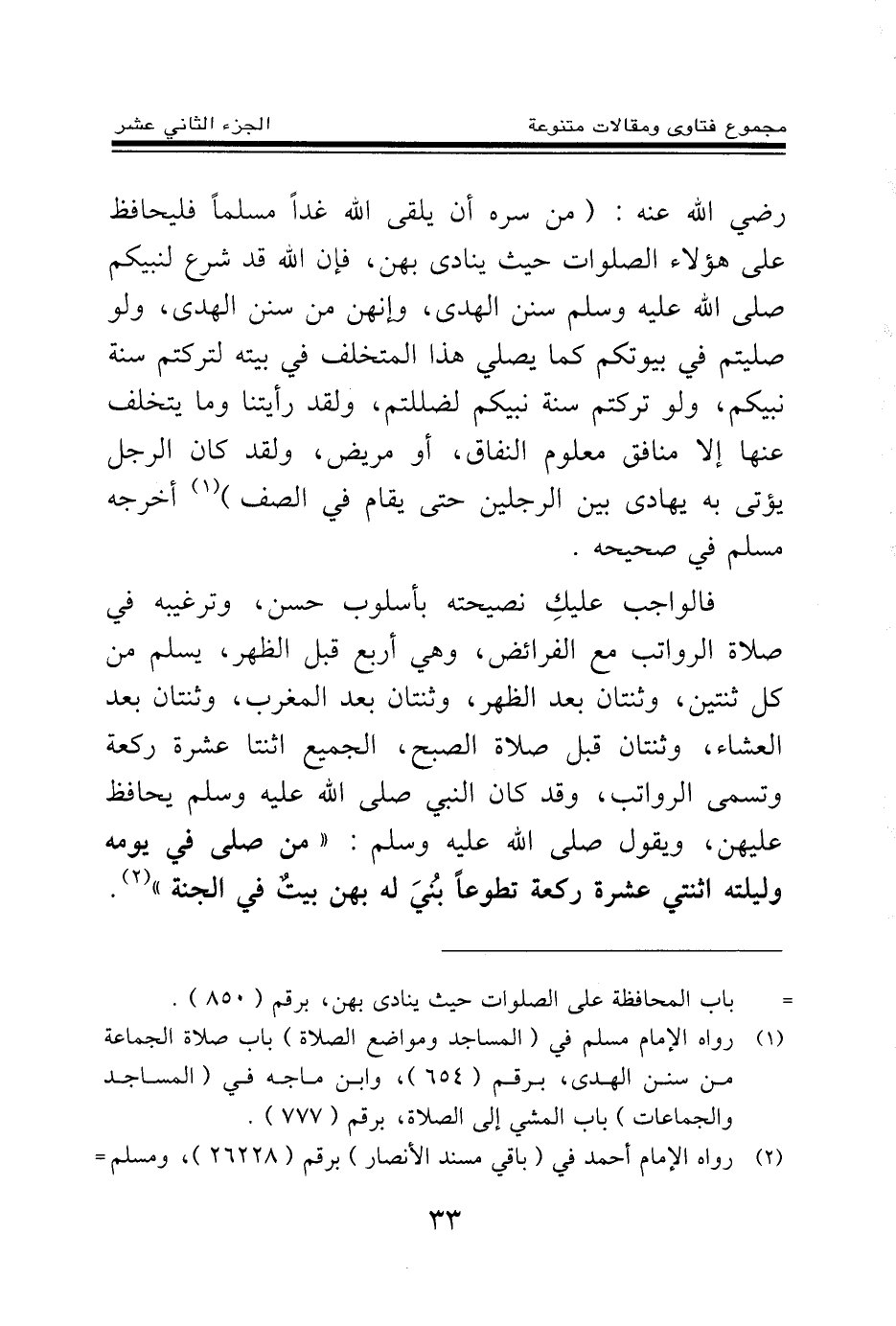 رضي الله عنه: من سره أن يلقى الله غدا مسلما فليحافظ على هؤلاء الصلوات حيث ينادى بهن فإن الله قد شرع لنبيكم صلى الله عليه وسلم سنن الهدى وإنهن من سنن الهدى ولو صليتم في بيوتكم كما يصلي هذا المتخلف في بيته لتركتم سنة نبيكم ولو تركتم سنة نبيكم لضللتم ولقد رأيتنا وما يتخلف عنها إلا منافق معلوم النفاق أو مريض ولقد كان الرجل يؤتى به يهادى بين الرجلين حتى يقام في الصف. أخرجه مسلم في صحيحه.