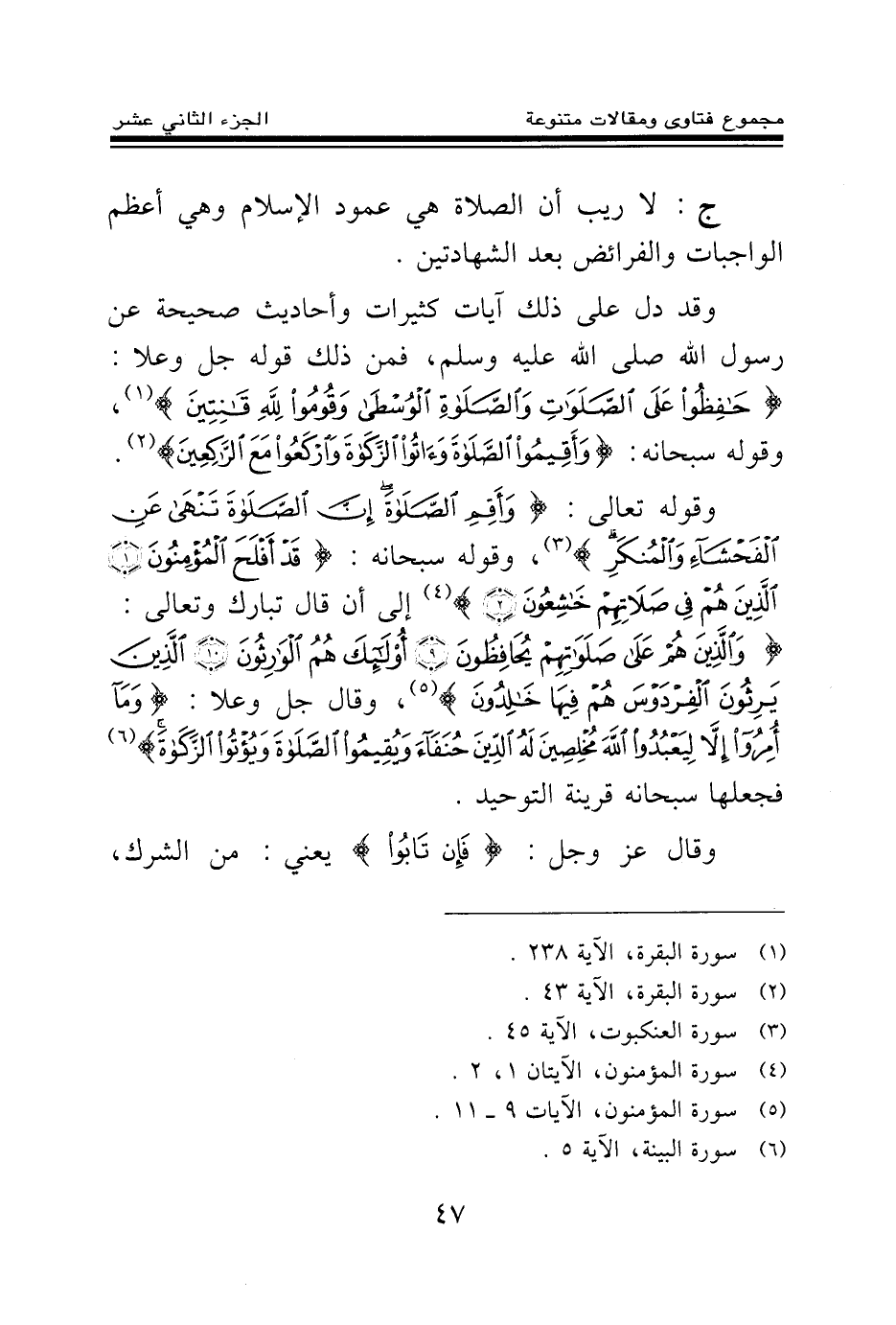 ج: لا ريب أن الصلاة هي عمود الإسلام وهي أعظم الواجبات والفرائض بعد الشهادتين. وقد دل على ذلك آيات كثيرات وأحاديث صحيحة عن رسول الله صلى الله عليه وسلم، فمن ذلك قوله جل وعلا: {حَافِظُوا عَلَى الصَّلَوَاتِ وَالصَّلَاةِ الْوُسْطَى وَقُومُوا لِلَّهِ قَانِتِينَ} (¬1) وقوله سبحانه: {وَأَقِيمُوا الصَّلَاةَ وَآتُوا الزَّكَاةَ وَارْكَعُوا مَعَ الرَّاكِعِينَ} (¬2) وقوله تعالى: {وَأَقِمِ الصَّلَاةَ إِنَّ الصَّلَاةَ تَنْهَى عَنِ الْفَحْشَاءِ وَالْمُنْكَرِ} (¬3) وقوله سبحانه: {قَدْ أَفْلَحَ الْمُؤْمِنُونَ} (¬4) {الَّذِينَ هُمْ فِي صَلَاتِهِمْ خَاشِعُونَ} (¬5) إلى أن قال تبارك وتعالى: {وَالَّذِينَ هُمْ عَلَى صَلَوَاتِهِمْ يُحَافِظُونَ} (¬6) {أُولَئِكَ هُمُ الْوَارِثُونَ} (¬7) {الَّذِينَ يَرِثُونَ الْفِرْدَوْسَ هُمْ فِيهَا خَالِدُونَ} (¬8) وقال جل وعلا: {وَمَا أُمِرُوا إِلَّا لِيَعْبُدُوا اللَّهَ مُخْلِصِينَ لَهُ الدِّينَ حُنَفَاءَ وَيُقِيمُوا الصَّلَاةَ وَيُؤْتُوا الزَّكَاةَ} (¬9) فجعلها سبحانه قرينة التوحيد.