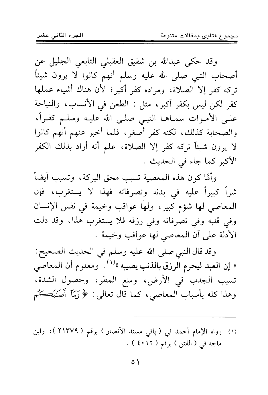 وقد حكى عبد الله بن شقيق العقيلي التابعي الجليل عن أصحاب النبي صلى الله عليه وسلم أنهم كانوا لا يرون شيئا تركه كفر إلا الصلاة، ومراده كفر أكبر؛ لأن هناك أشياء عملها كفر لكن ليس بكفر أكبر، مثل: الطعن في الأنساب، والنياحة على الأموات سماها النبي صلى الله عليه وسلم كفرا، والصحابة كذلك، لكنه كفر أصغر، فلما أخبر عنهم أنهم كانوا لا يرون شيئا تركه كفر إلا الصلاة، علم أنه أراد بذلك الكفر الأكبر كما جاء في الحديث.